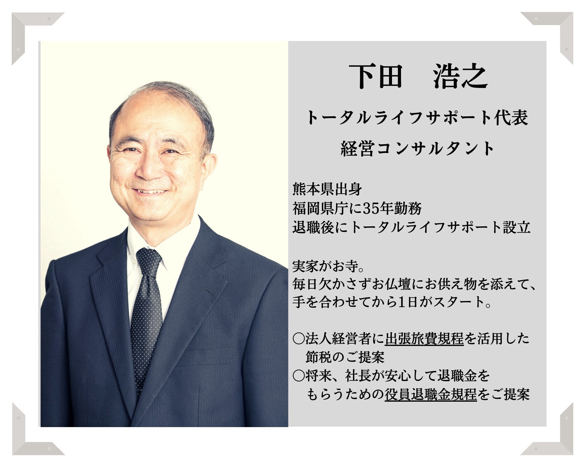 私自身の本業は経営コンサルタントとしてトータルライフサポートを運営しています。