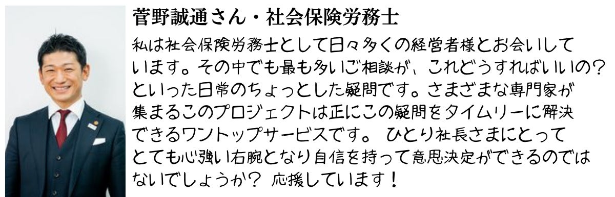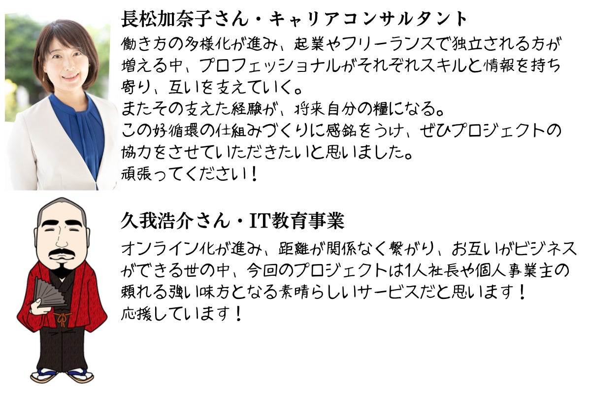 経営不振、スタッフ不足、取引先とのトラブル、相続、事業継承など弁護士や司法書士、経営コンサルタントのアドバイスが必要なものから、HPをつくりたい、ファッションコーディネートしてほしい、投資、保険の見直し、旅行手配、自分史をつくりたい、永代供養したい、プロフィール写真を撮りたいなどどんな悩みや相談でも対応できる士業と各分野の専門家を揃えています。