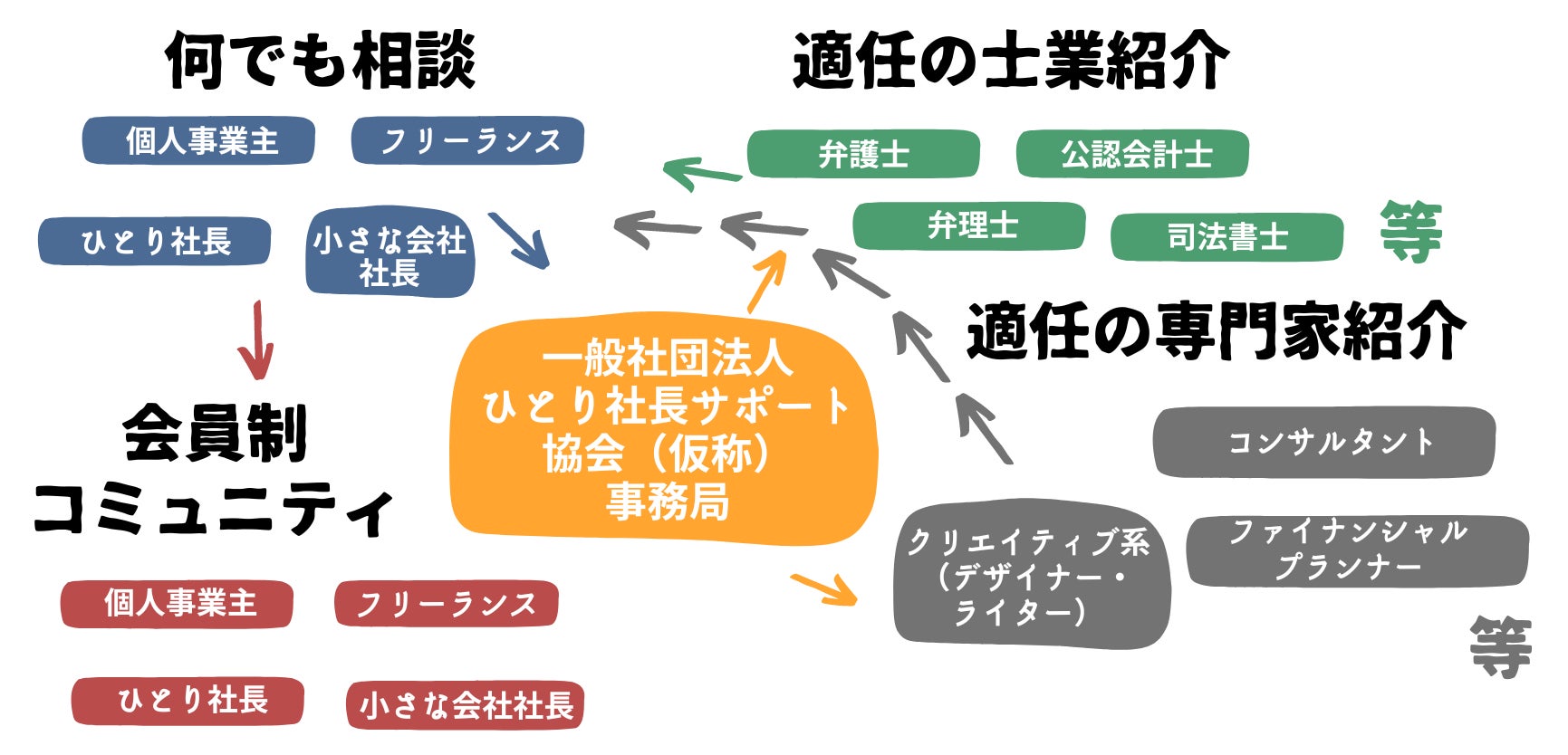 「ひとり社長サポート協会」では、ひとり社長でも付き合いやすく、二人三脚でお手伝いできる専門家の紹介をさせていただいています。