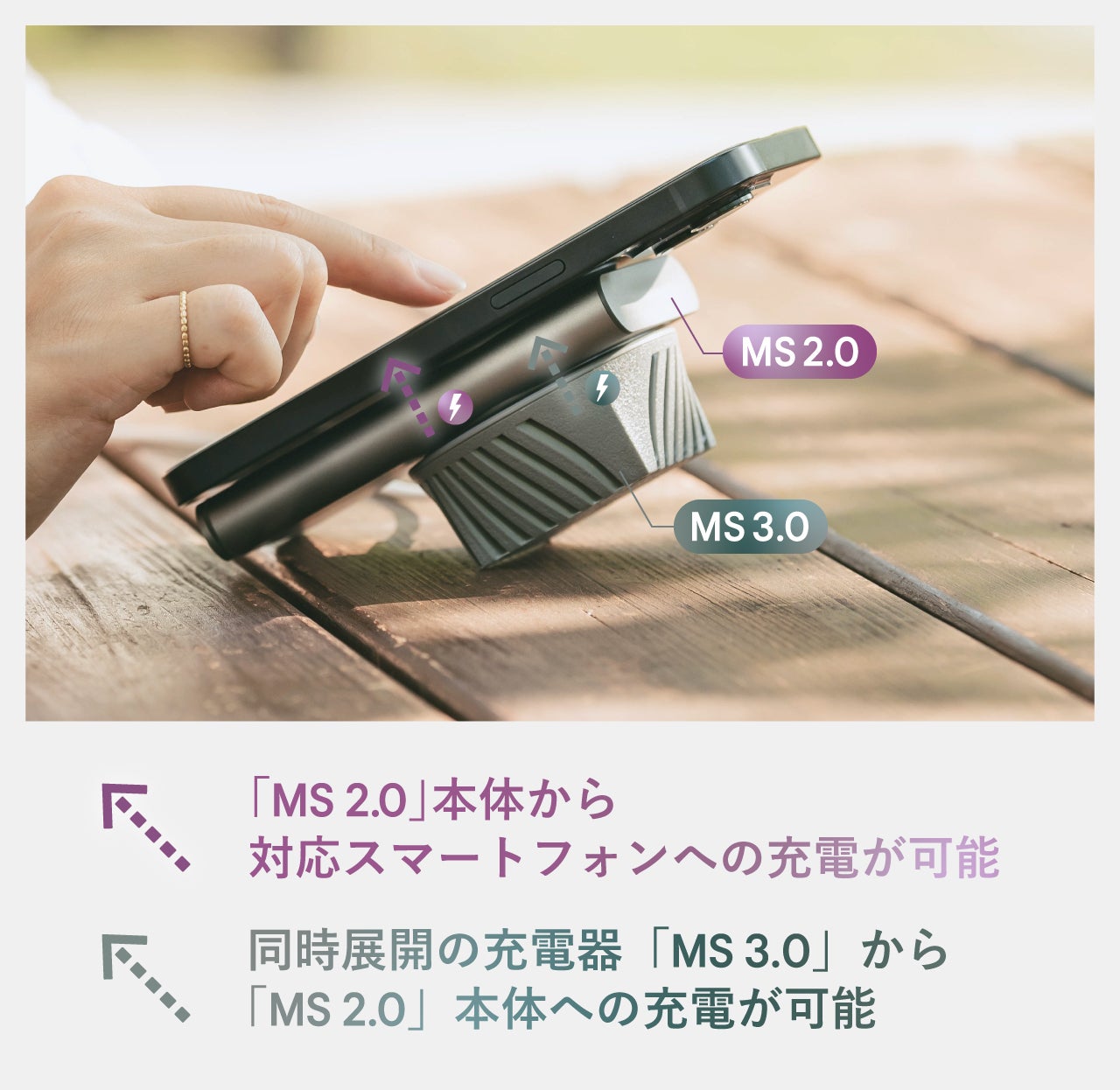 併用することでスマホをワイヤレス充電しながら「MS2.0」も同時にワイヤレス充電できる。ストレスフリーな次世代型のモバイルバッテリーです。