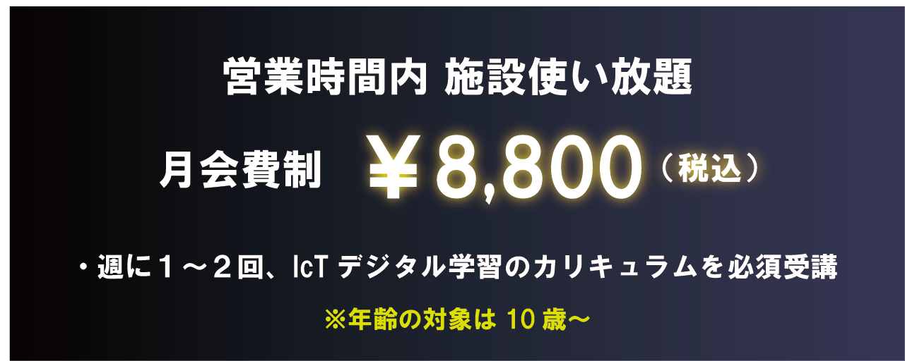 会員様には、週に1~2回、P検をベースとしたカリキュラムを受講していただき、IcTリテラシーの知識・スキルを身に着けていただく事を必須とし、その他の施設営業時間は利用し放題となります。