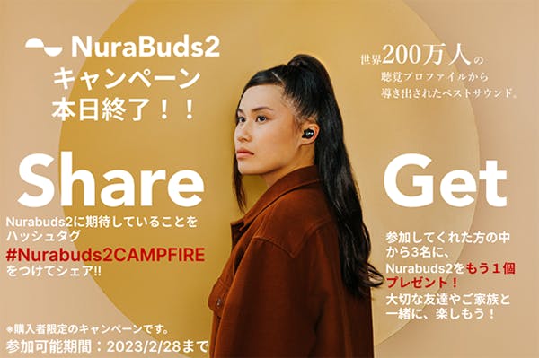 2023/02/28 08:00Nurabuds 2にご興味頂いている皆様、お世話になっております!Nura Japanです!CAMPFIREにて支援額1000%を突破したNuraBuds2の先行予約キャンペーンは遂に本日までとなりました。まだ数量限定割引価格で購入できますのでご興味がある方は、今すぐ下記よりページをチェックしてみてください!既存のNura製品をお持ちの皆様にとってもスポーツシーンやご家族や大切な方への贈り物としても最適な製品となっております。・パーソナライズが移行可能=一度対応したNura製品でパーソナライズを行ってプロファイルをNuraBuds2へ転送すれば、NuraBuds2でもあなただけのサウンドでお楽しみいただけます。・パーソナライズしていなくてもベストサウンドを提供しますので、普段使いの低価格イヤホンの中では音質にこだわりたい方にぴったりです。人気Youtuberのセゴリータ3世さまとカジェログ(かじかじ)様にも高評価をいただきました!詳しくは、こちらからご覧ください。セゴリータ三世様のレビューはこちらカジェログ(かじかじ)様のレビューはこちら先日から行っている、1000%達成を記念キャンペーンも残りわずかです!!下記リンクから、ハッシュタグをつけて、Nurabuds2に期待していることをシェアすると、抽選で3名様にNurabuds2をもう1個プレゼントいたします!※購入者限定のキャンペーンです。参加可能期間:2023/2/28まで是非、参加をお待ちしております!!それでは、残りのキャンペーン期間もどうぞ応援よろしくお願いいたします!! Nura Japan もっと見る