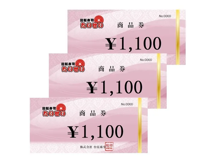 回転寿司たいせいで使える3,300円分のお食事券をプレゼント!!お食事券はご自宅に郵送させて頂きます。