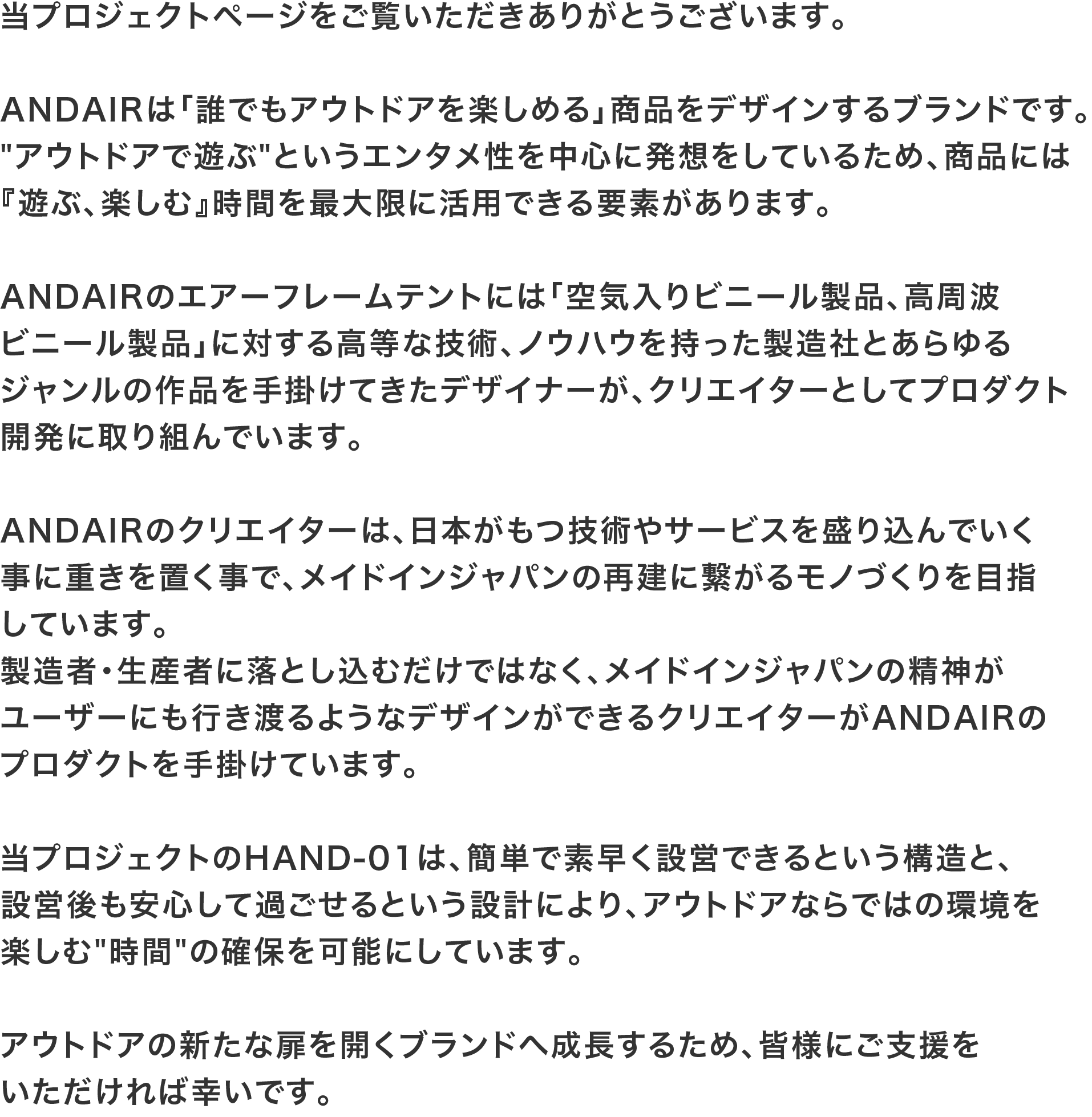 2023/09/26 10:57開始7日目、目標金額に達することができました。ご支援、ご協力くださった皆様、本当にありがとうございました!超早割のテントだけではなく、タープ付属のスターターセットの方もご支援を多数いただきました。皆様にANDAIRのプロダクトを幅広く楽しんでいただければ幸いです。引き続き当プロジェクトではご支援いただく方にお得なリターンをご用意しております。気になる点、ご質問事項がある場合は、お気軽にメッセージをいただければと思います。プロジェクト終了までよろしくお願いいたします。 もっと見る