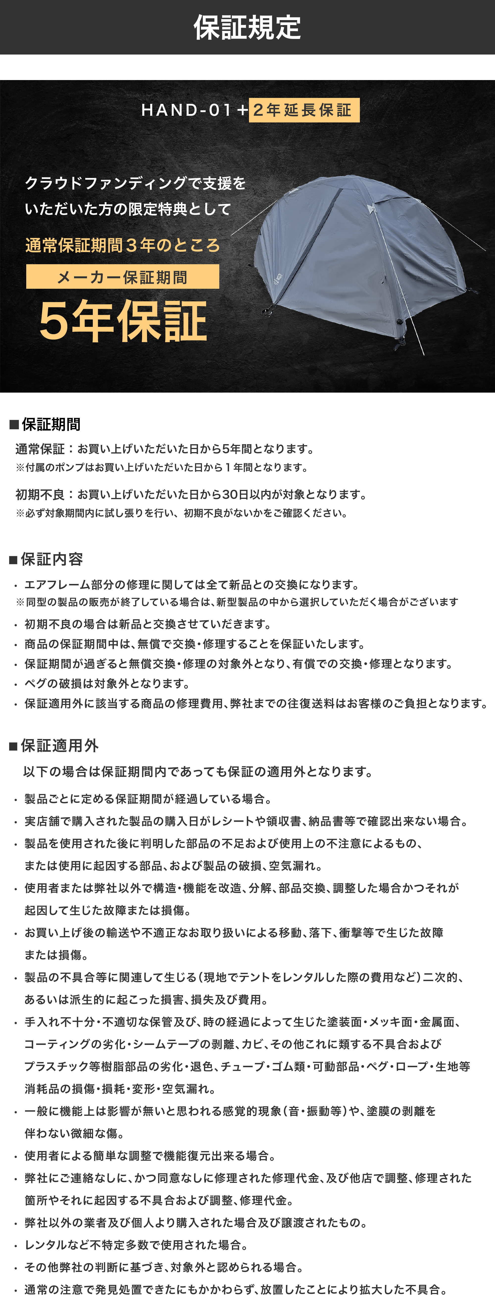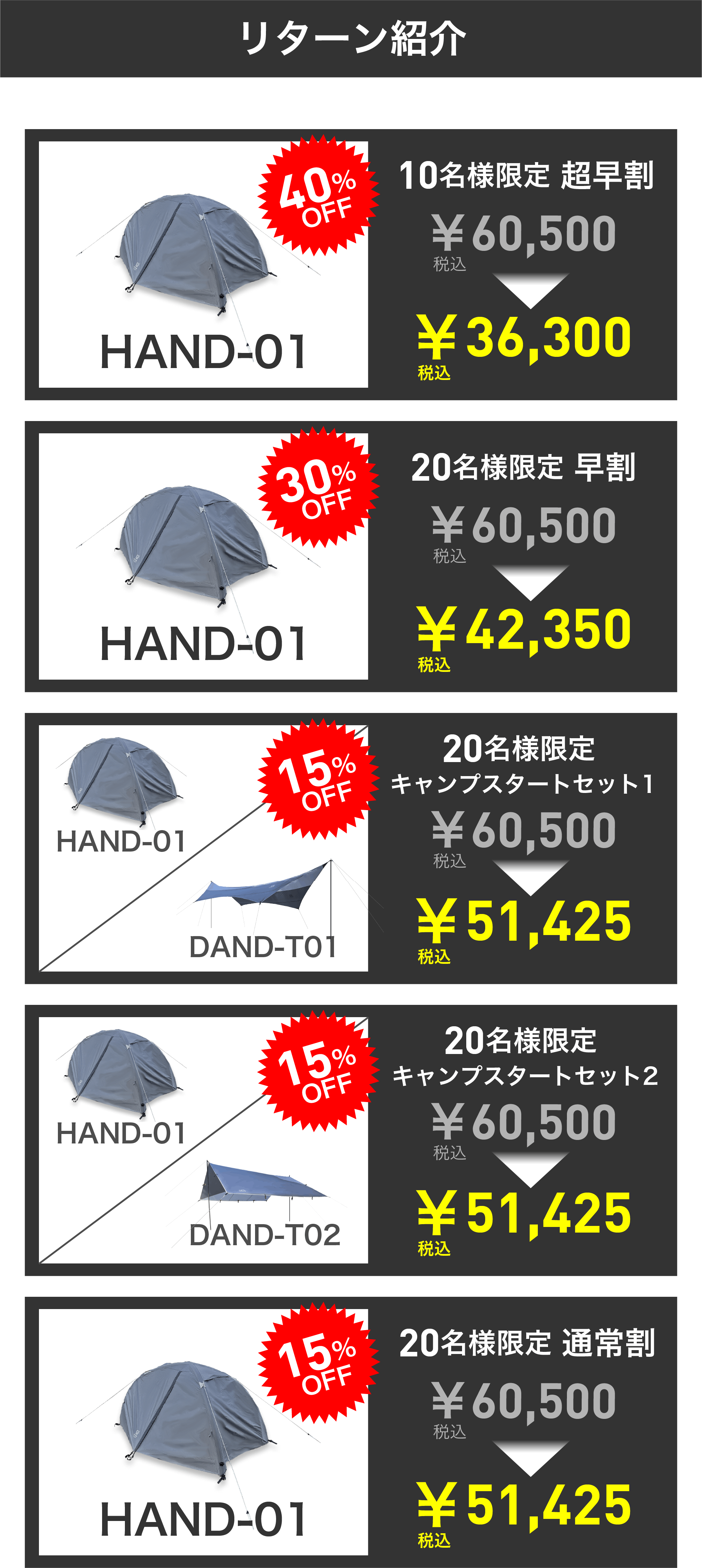 2023/09/24 14:32沢山のご支援ありがとうございます!超早割40%OFFのHAND-01がおかげさまで完売致しました。予想よりも早い完売に、ソロキャンプの需要を感じております。ご支援いただいたキャンプ好きの皆様、関係者一同心より感謝申し上げます。引き続き、早割で30%OFFが20名様限定でご用意しておりますので。ご興味ある方は是非ご覧になってみてください。 もっと見る
