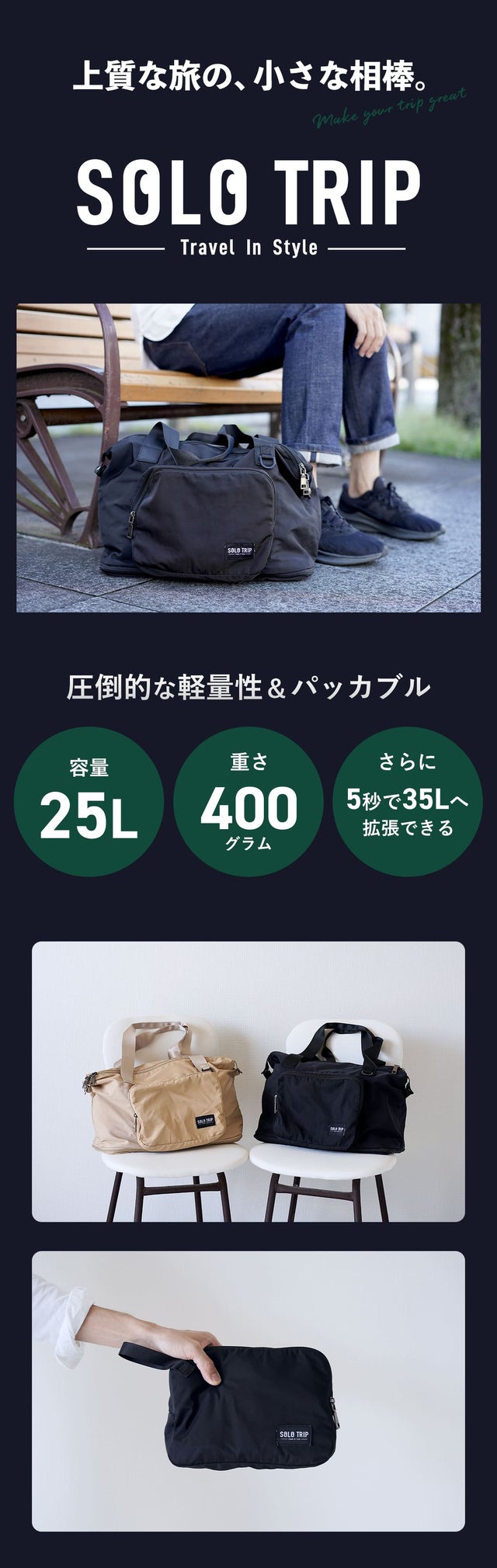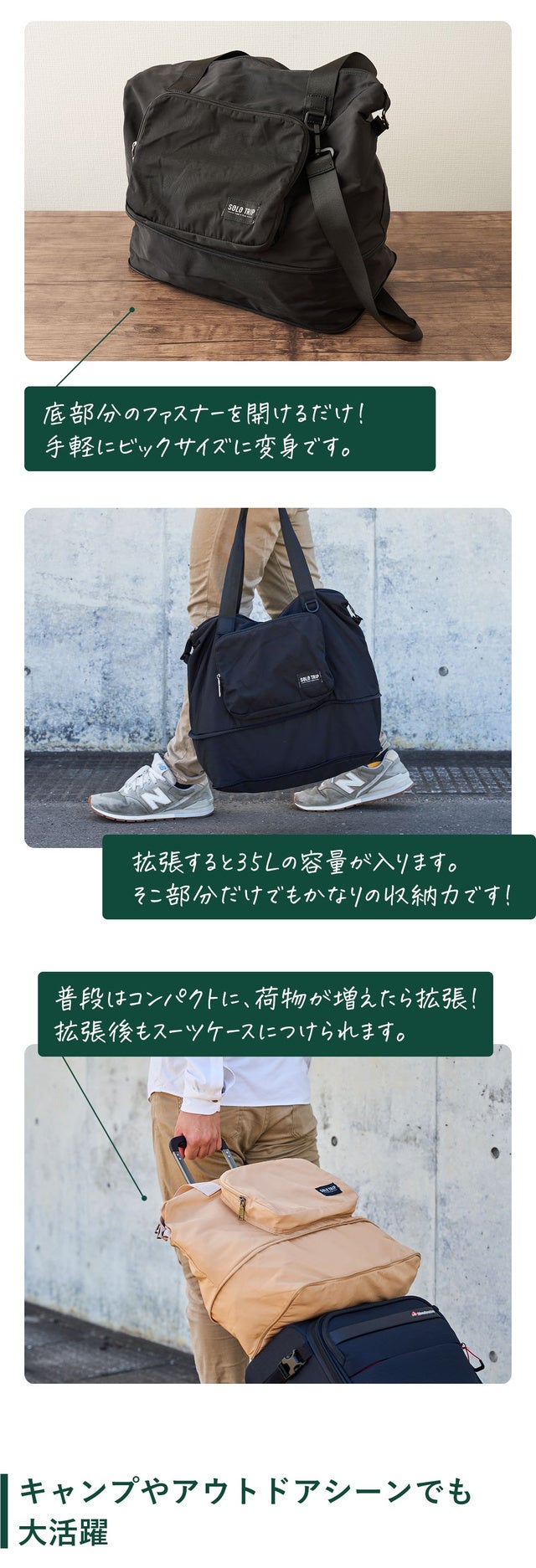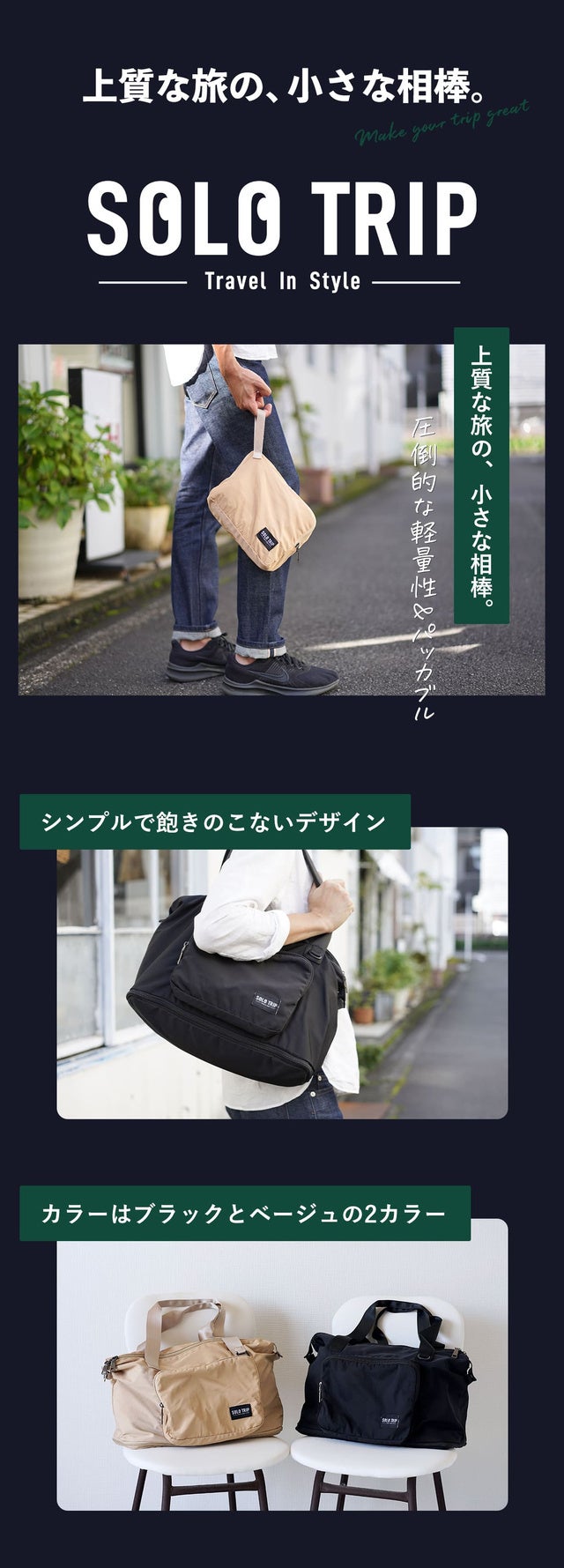 普段使いから一般の旅行使いを意識した、丈夫で軽い、ミニマムですっきりしたデザインのパッカブルトート「SOLO TRIP」。