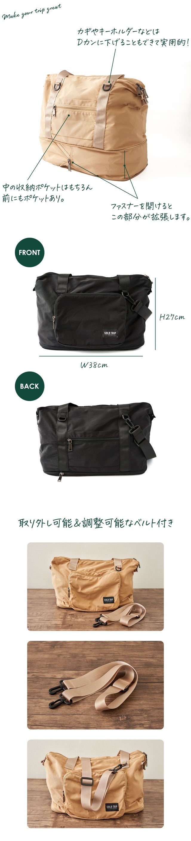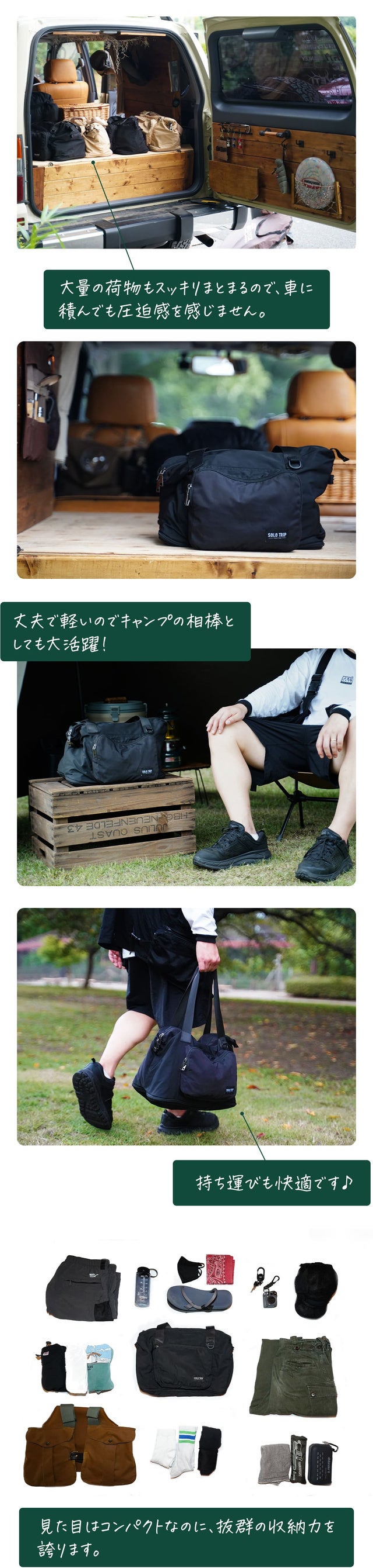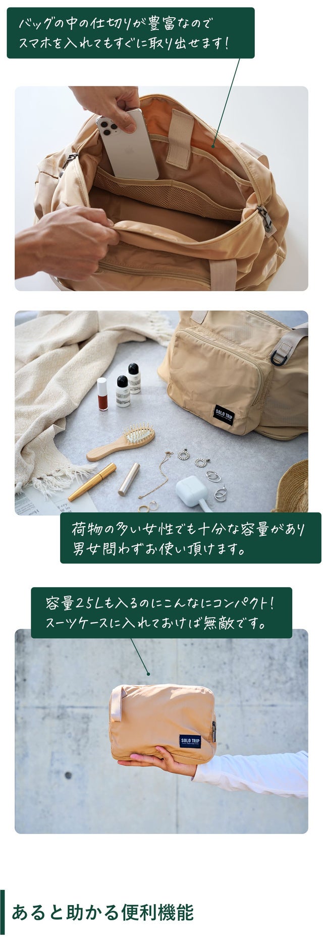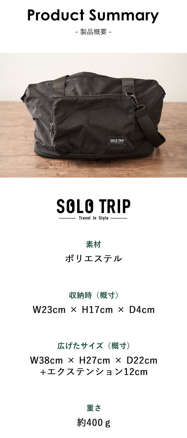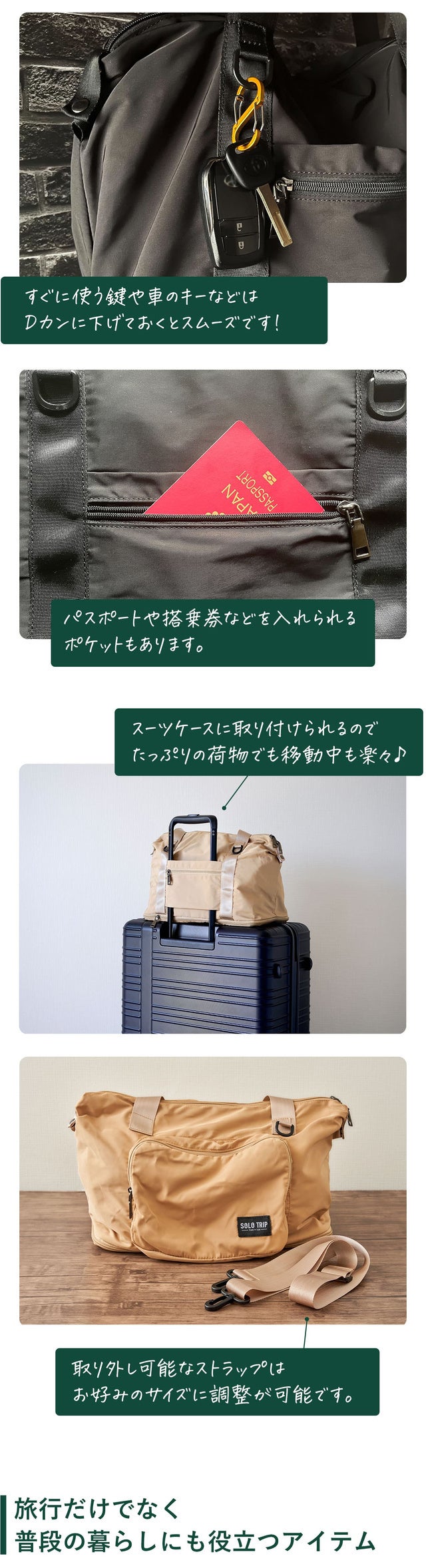 国内外の旅行には欠かせない必須アイテム!!お土産で荷物が増えてスーツケースに入りきらない、でも現地でバッグを買うのはもったいない....たたんで収納できる折り畳みバッグは旅行やお出かけに大活躍。機内持ち込み対応サイズなので、荷物を入れ分けて持ち運びも可能です。お土産で増えた荷物や溢れた荷物も心配無用。"SOLO TRIP"があれば大丈夫。思いきりショッピングを楽しめます。容量25Lで1泊〜2泊分の荷物が入り、このバッグひとつで身軽に旅が楽しめます。