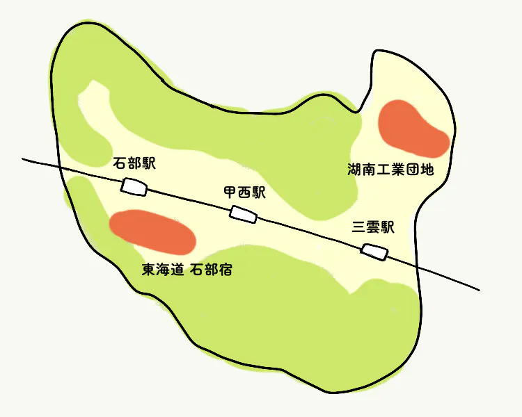旧東海道の石部宿、旧甲西町域には県内屈指の工業団地である「湖南工業団地」が存在します。