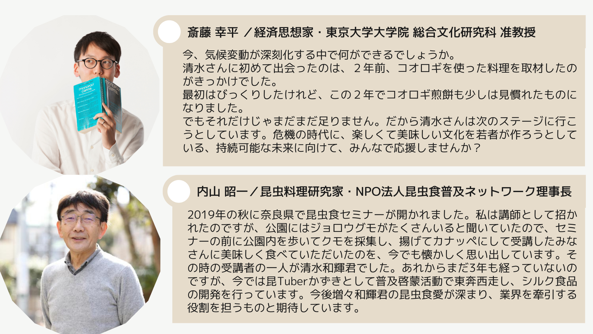 活動を新聞やメディアで取り上げていただけることも増え、昆虫食好きで知られるタレント・井上咲楽さんや、元環境大臣・小泉進次郎さんなど、様々な方と配信してきました。