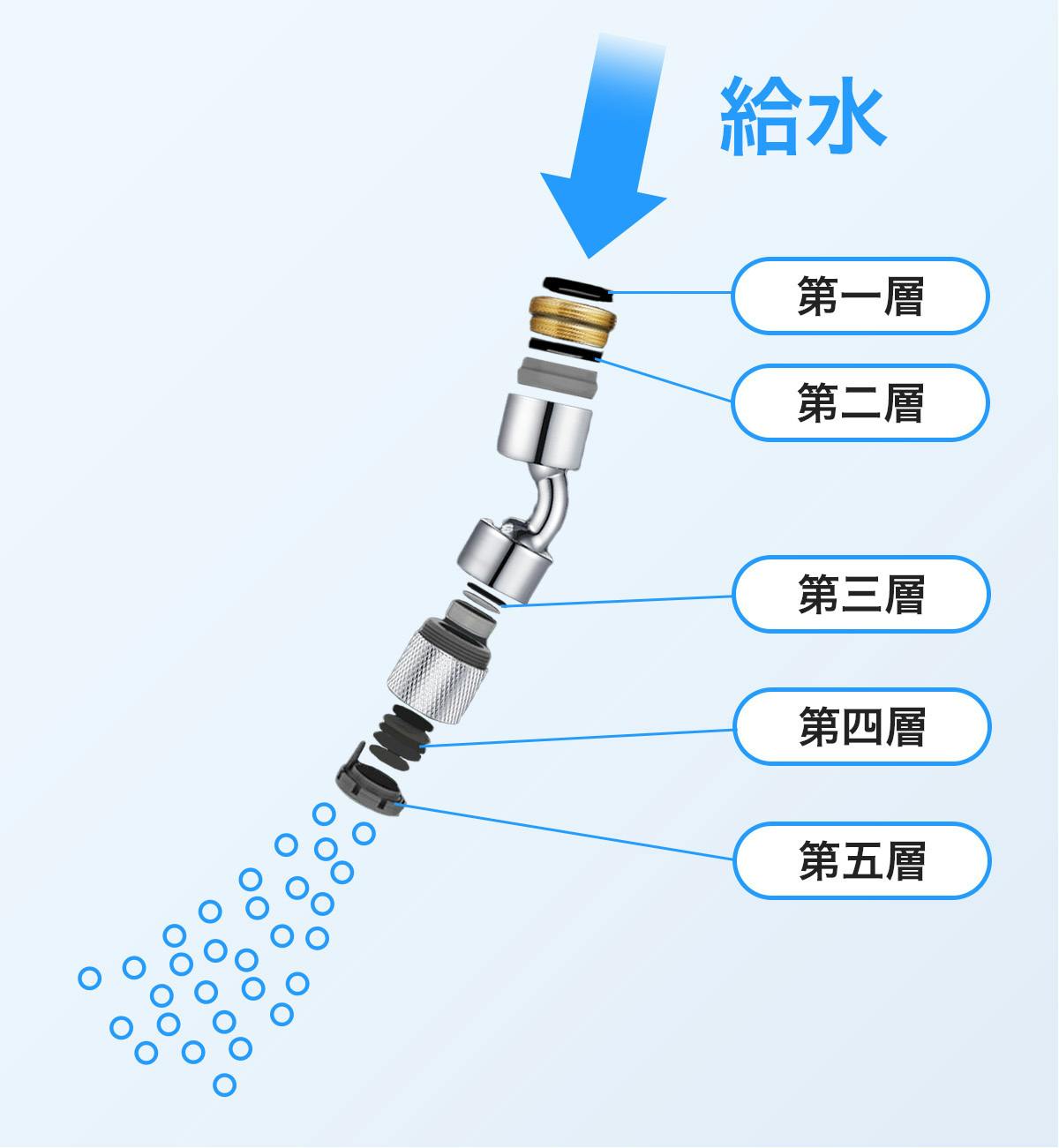 5つのフィルターを設置することで、気泡のせん断し、マイクロバブルが作り出されます。