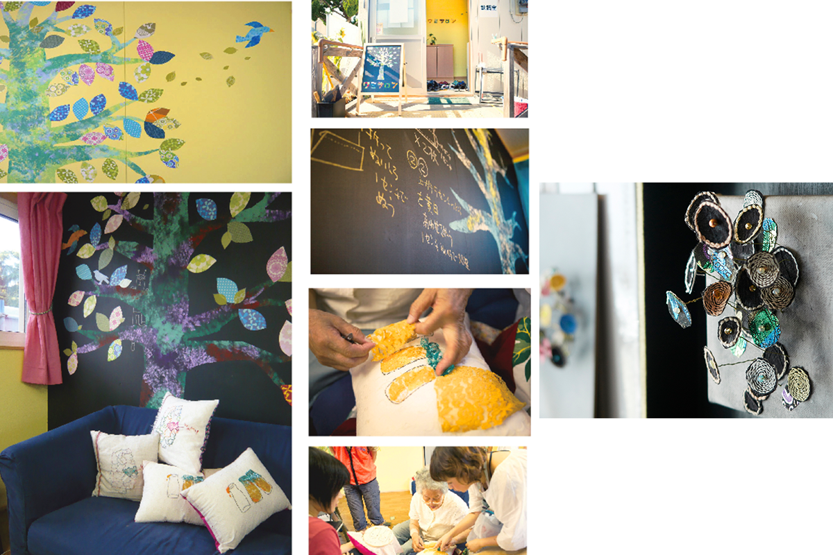 左から二列:「岩手県宮古市仮設住宅アートプロジェクト」仮設住宅の談話室をアートの力で人が繋がる場所に。企画デザインアート制作を手がけました。布小物や壁の絵などは住民の皆さんと一緒に仕上げました。