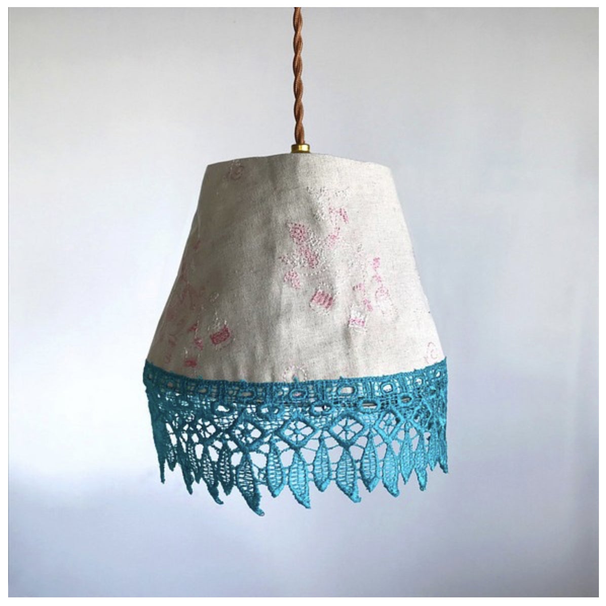 ペンダントランプのシェイド部分の布・・・名前は「イト・トリドリ」。岡山の刺繍レース布アトリエ「音の絵」さんと一緒に(柄のデザインを担当させていただきました)作ったオリジナルファブリックです。打ち合わせなどで訪れた時に感じた「岡山」の空気、色、みなさんとの楽しいおしゃべり・・・そこから発想した、小さな”糸”と”ことり”の物語をデザインした原画を、職人さんたちが丁寧に仕上げてくださった国産刺繍レース布(綿麻地)です。