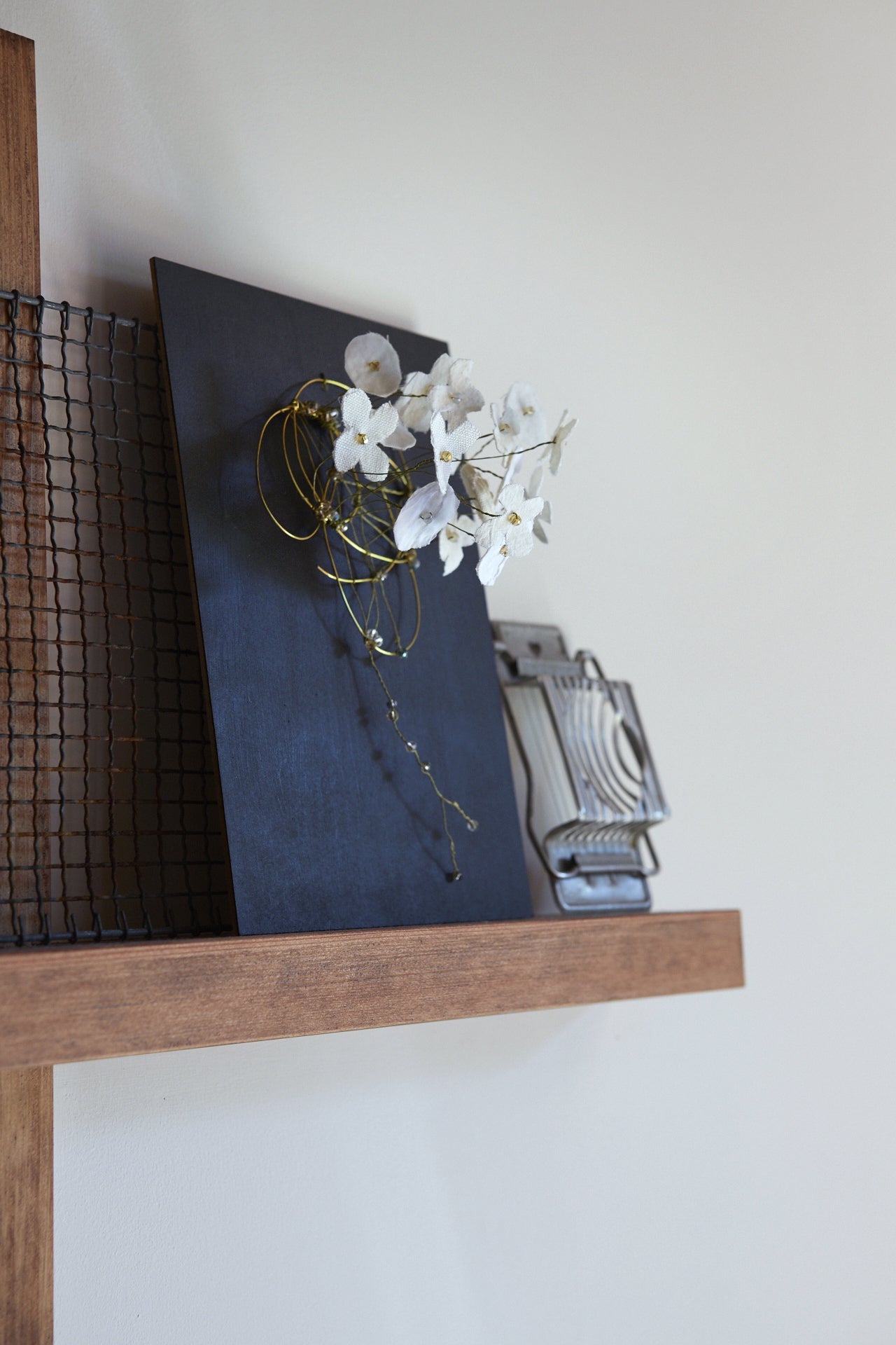 右:「ペラペラヨメナ ウオールデコレーション木箱」路傍に咲くペラペラヨメナという野花のbouquetをお部屋で楽しめたら・・・その思いをストレートに表現した作品