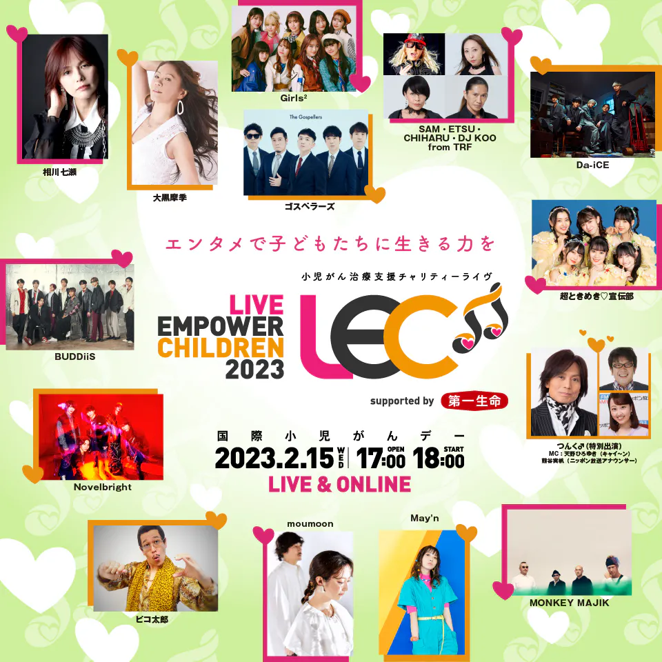 コロナ禍で小児がんと闘っている子どもたちとご家族の皆さまを「音楽で元気づけたい」という我々の強い想いにご賛同いただいたアーティストや企業の皆さまからのご支援により、“エンタテインメントは、子どもたちの「生きる力」をつくる。” をテーマにした、小児がんと闘う子どもたちや、そのご家族を元気づけるためのチャリティーライヴ【LIVE EMPOWER CHILDREN 2023 supported by 第一生命保険】を開催いたします。