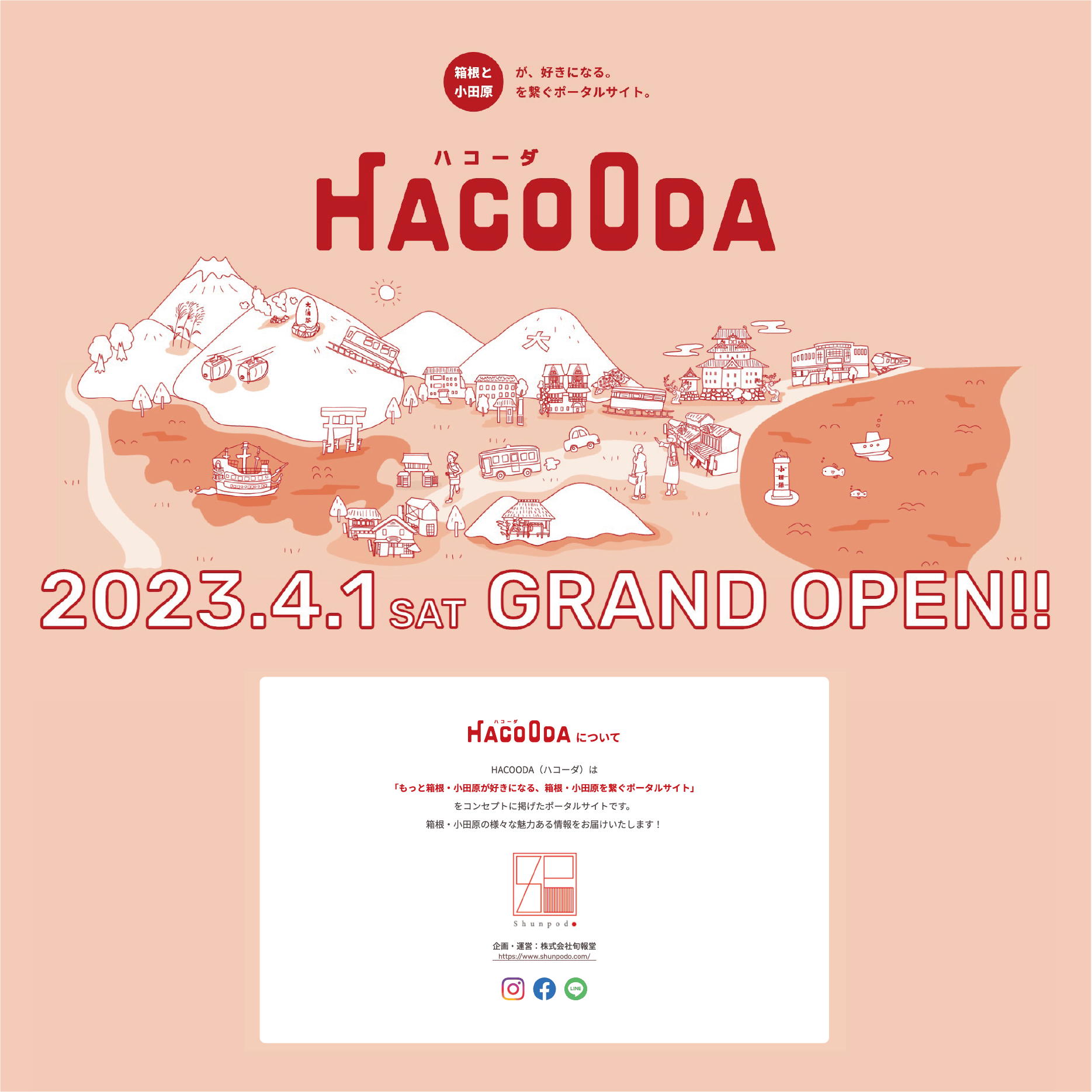 2023/03/18 17:30こんにちは!HACOODA編集部です。箱根・小田原ポータルサイト『HACOODA』\2023年4月1日グランドオープンが決定しました/グランドオープンに向けて本日よりプレオープン!楽しい仕掛けのあるティザーサイトも公開中です。ぜひアクセスしてみてくださいね!**************************************************箱根・小田原ポータルサイト『HACOODA』https://hacooda.com/**************************************************箱根・小田原の最新情報やお得なキャンペーン情報やクーポンをお届けするLINEお友達登録もぜひお願いします。『HACOODA』(ハコーダ)は「もっと箱根・小田原が好きになる、箱根・小田原を繋ぐポータルサイト」をコンセプトに掲げたポータルサイトです。箱根・小田原の様々な魅力ある情報をお届けします!HACOODAオープンまで、いよいよあと2週間となりました!!!グランドオープンまで駆け抜けますので楽しみにお待ちくださいませ♪ もっと見る【御礼】プロジェクト終了の御礼とご報告‼