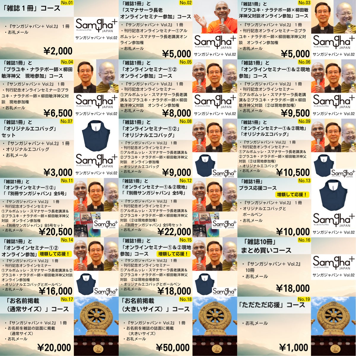 『サンガジャパン+ Vol.2』1冊(定価2,750円を2,000円にて)と「刊行記念オンラインセミナー①②(①②ともオンライン参加)」のセットに、支援金を増額して応援するコースです。