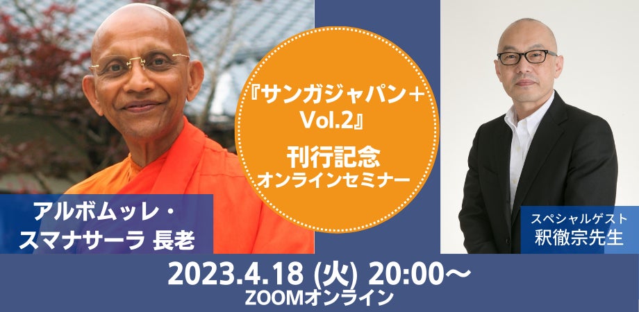 2023年4月18日(火)に、アルボムッレ・スマナサーラ長老による『サンガジャパン+ Vol.2』刊行記念オンラインセミナーを実施します。当日はスペシャルゲストとして僧侶で宗教学者、相愛大学学長でもある釈徹宗先生にご参加いただくことが決定しました!