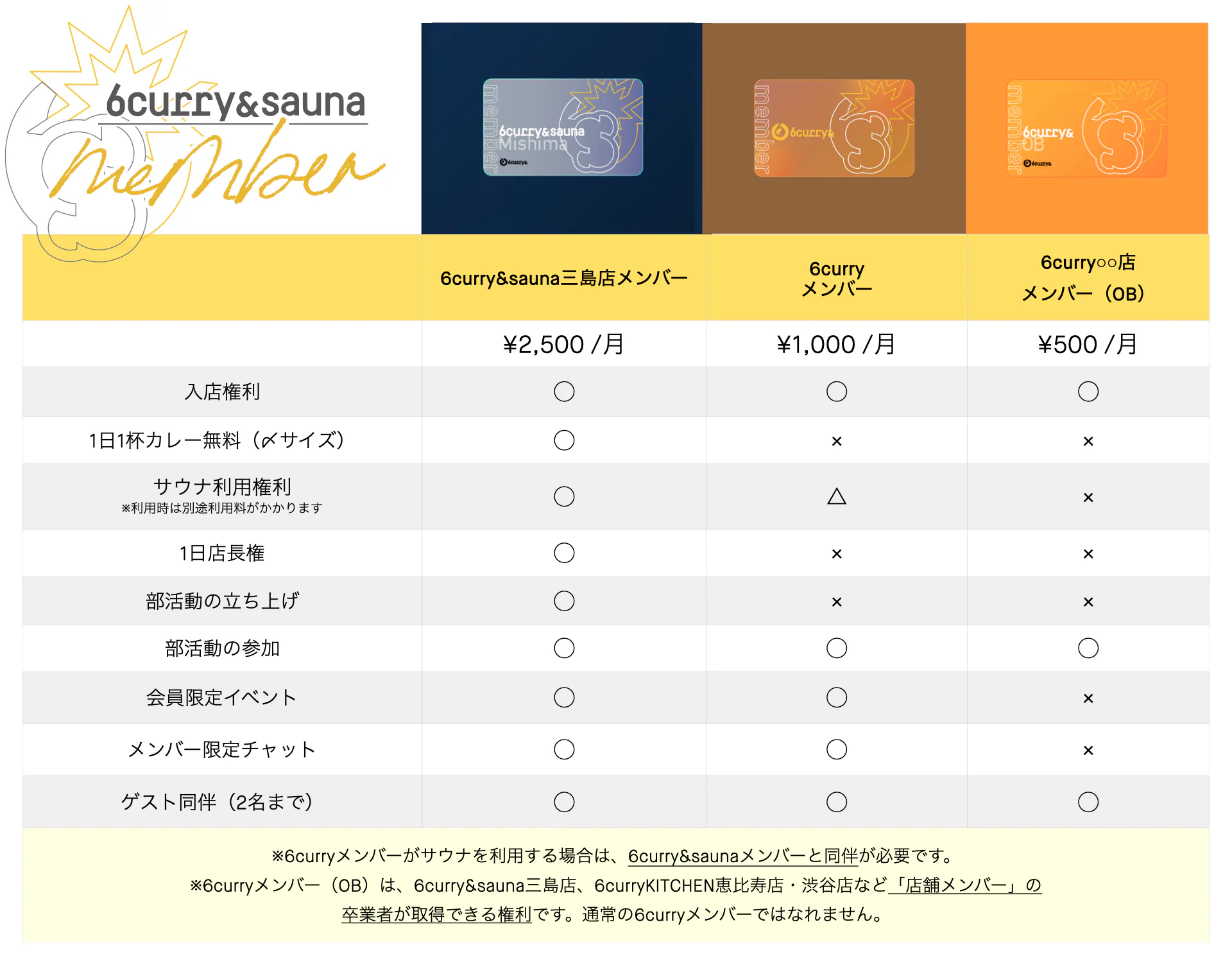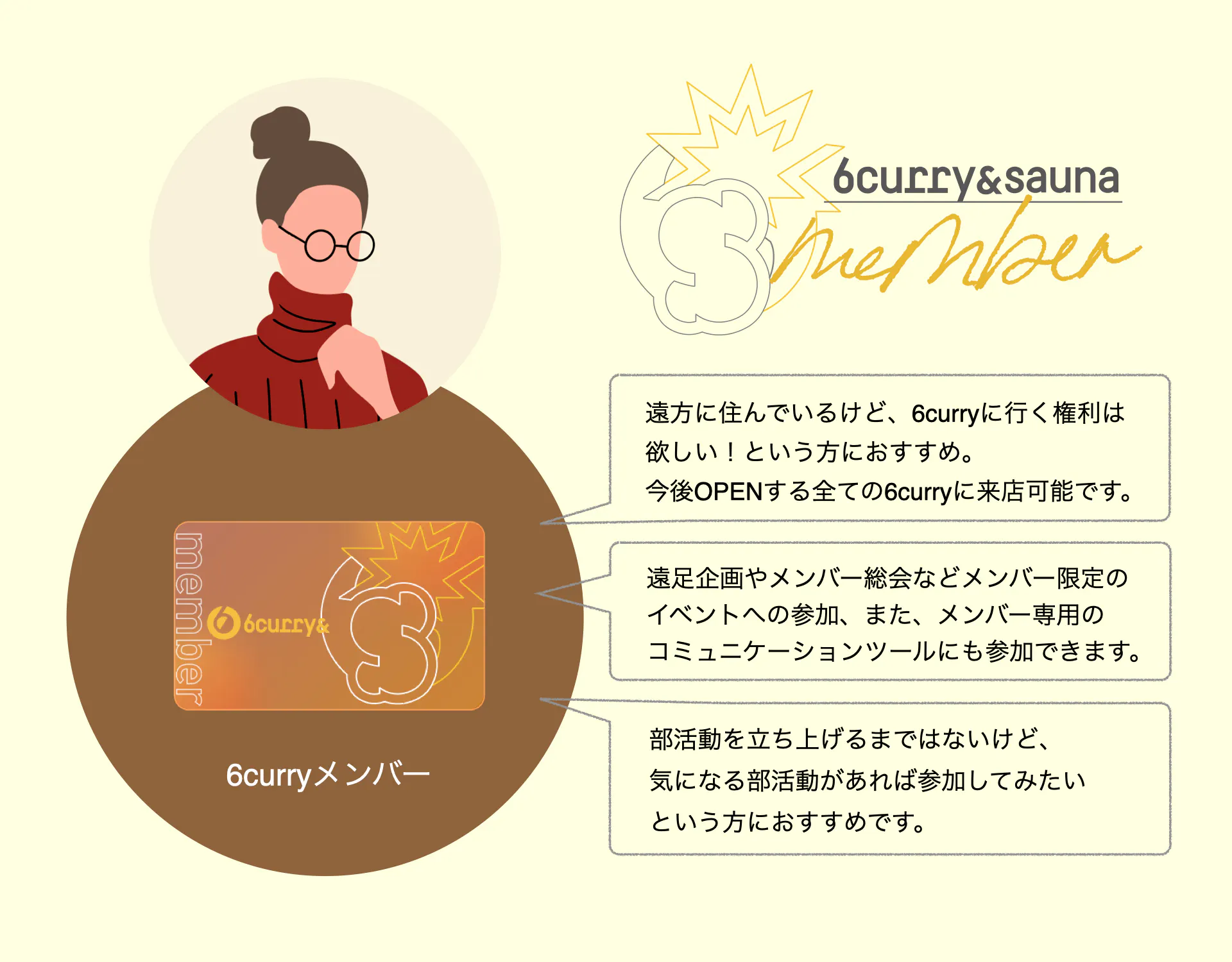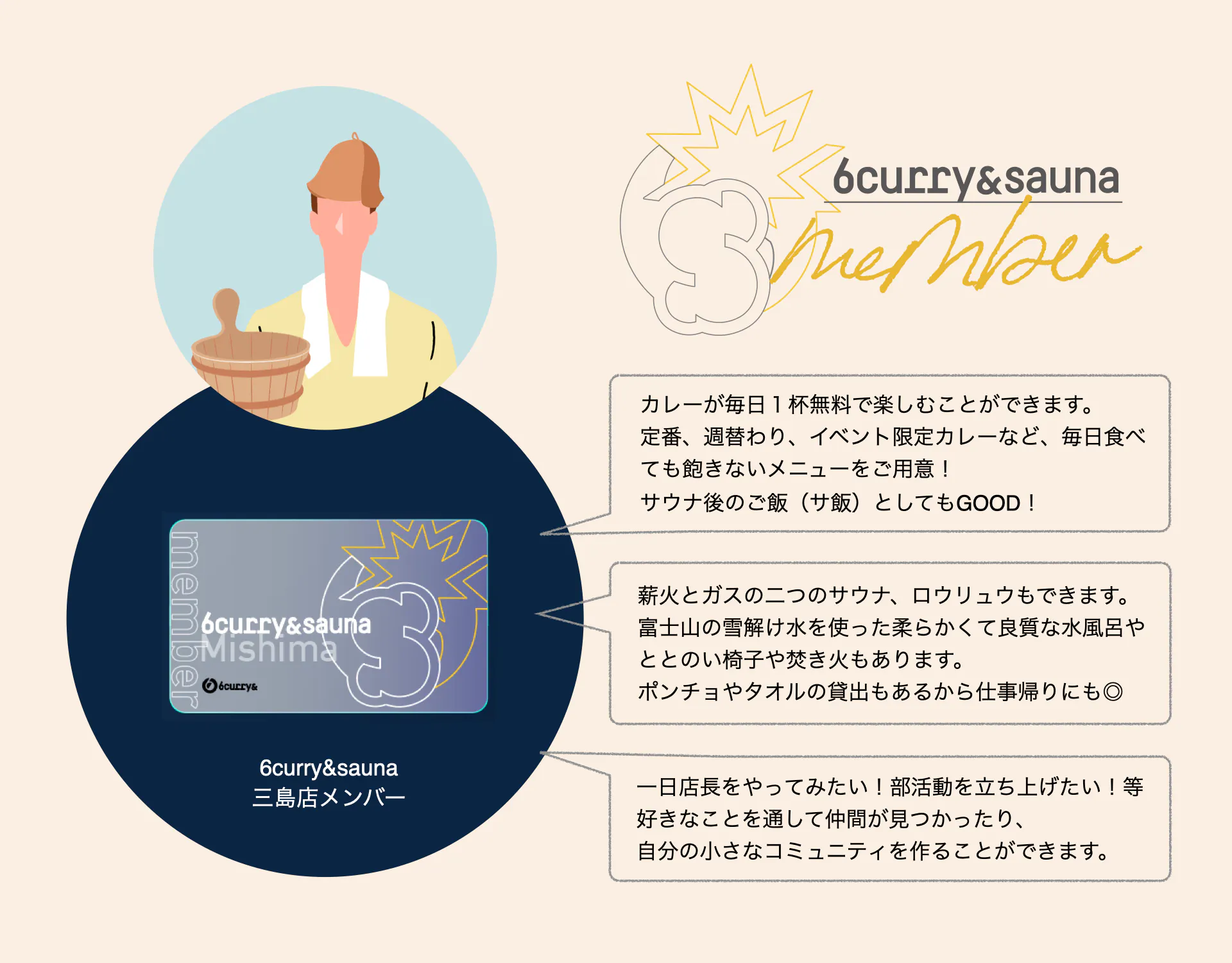これまで同様、6curryメンバーになると、カレーが毎日一杯無料で食べられるほか、サウナを利用できたり、部活動に参加できたり、新しい出会いのきっかけになる様々なコンテンツを楽しむことができます。