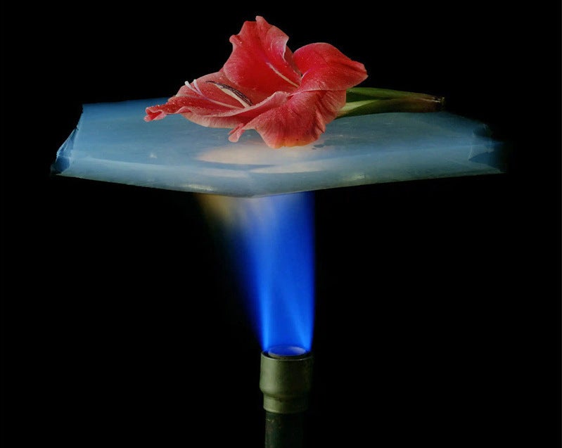 エアロゲルは「断熱性」にとても優れた素材です。下からの炎にエアロゲル素材を挟むことで、熱を遮断している様子が分かります。炎で炙っていますが、エアロゲルの上に乗っている花に変化はありません。