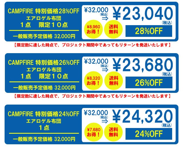 2024/01/24 13:44サポーターの皆様このたびはご支援とたくさんのお気に入りをありがとうございます。プロジェクト期間が残り5日を切りました。お気に入りをしていただいてエアロゲル布団にご関心をお持ちの方は、プロジェクトが過ぎてしまうとこのご支援額でご支援いただけなくなりますので、この機会をお見逃しなくこのプロジェクトが終了する前にご支援を賜りましたら幸いです。引き続きエアロゲル布団をよろしくお願い申し上げます。 株式会社フェリクス もっと見る