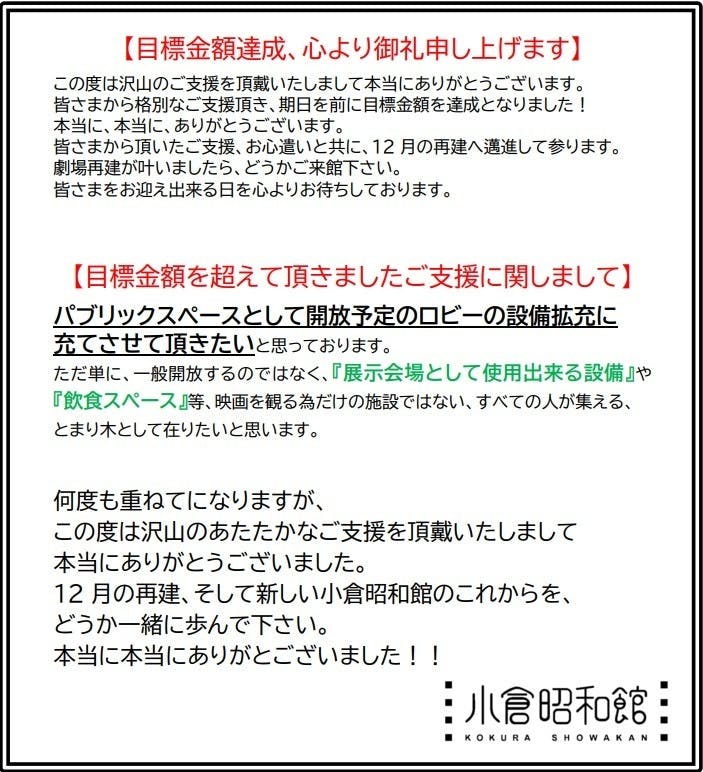 2023/04/25 13:37小倉昭和館です。まちの小さな映画館の大きすぎる夢へ、沢山のご支援を頂戴いたしまして本当にありがとうございます。3000万円という高額なご支援をお願いしたにも関わらず、この度、期限を前にクラウドファンディング目標金額に到達いたしました!!あたたかいご支援、応援のお言葉を頂戴いたしまして、本当に本当にありがとうございます。皆さまから頂きましたご支援とご厚志で、12月の再建まで邁進して参ります。何度も何度も重ねてになりますが、本当にありがとうございます。また期間終了までに目標金額を超えて集まったご支援に関しましては、パブリックスペースの拡充の為、使用させて頂きたいと考えております。ただ映画をご覧にならない方へロビーを開放するだけでなく、すべての人が集えるような居心地の良い場所づくりに努めて参りつくって参ります。その為に、展示設備や飲食スペースを整える等、映画を観るためだけの施設ではない、すべての人の居場所としてあれるような場を作っていきます。どうか皆さま、"12月の再建"・そして"再建後の小倉昭和館のこの先"を、一緒に歩んで頂けますと幸いです。 もっと見る