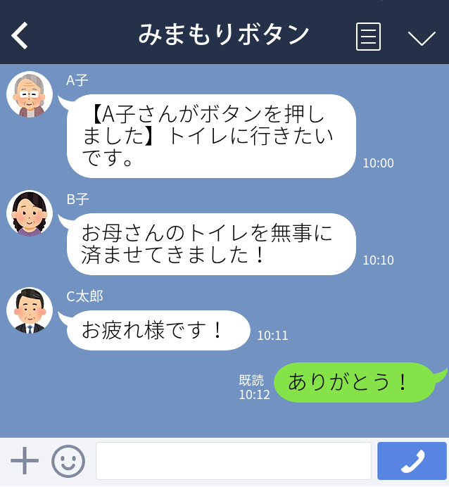 「キテネ」からのメッセージは、LINEグループで共有することができます。つまり、複数の人で介護をしている場合、都度連絡をしなくても、どんな様子で過ごしているかを共有することができるのです。