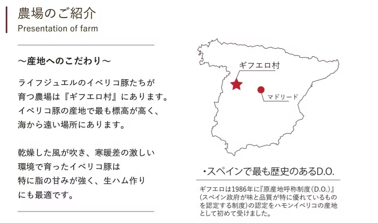 「マドリードのメイン通りには毎日多くの観光客がやってきます。そんな中で本物のスペイン食材を気軽に楽しんでもらいたいと思っています。メインは海鮮料理ですが、スペインと言えばやっぱり生ハムは外せません。基本的に食材を仕入れるときには生産者を訪れて、物だけではなく姿勢も大事なポイントと考えています。ギフエロ産イベリコ豚と言えばスペインではまず間違いない生ハムだと思います。私も多くの生産現場を見てきましたが、農場や加工場、熟成まですべて一社で行っているイベリコ豚農家はほとんどありません。日本には行ったことがないですが、スペインと日本は食文化が似ているのできっと美味しいと思ってもらえると思います」