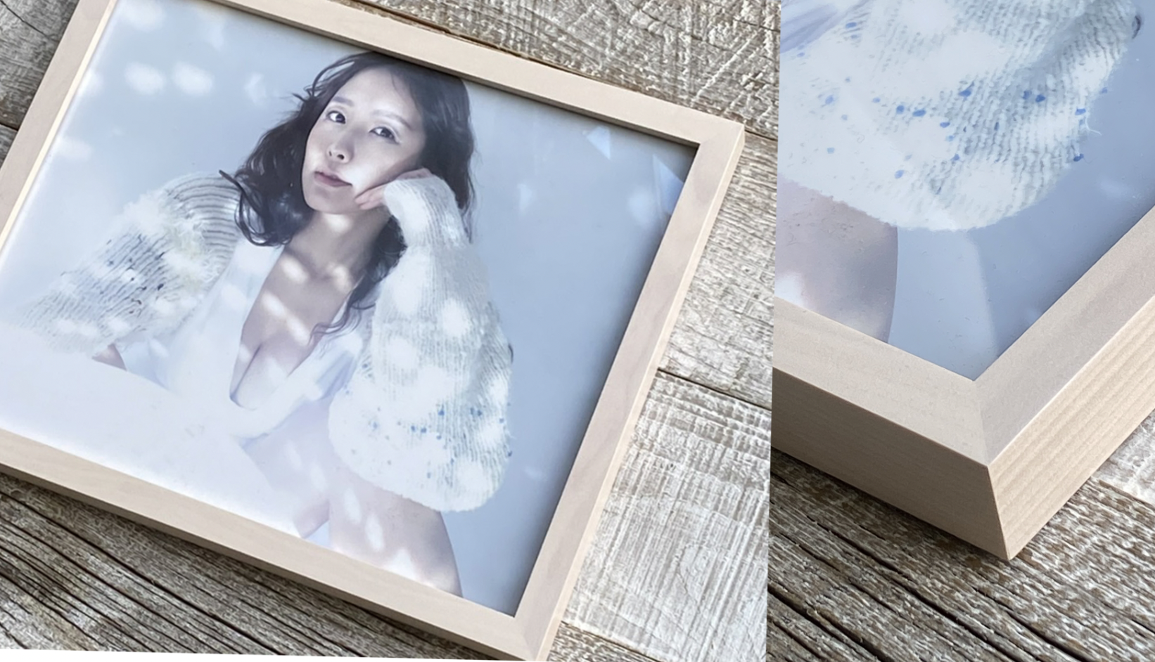 A4の額装のイメージです。210x297cmの大きさのプリントが白木のセンス良い額にピッタリと入っています。