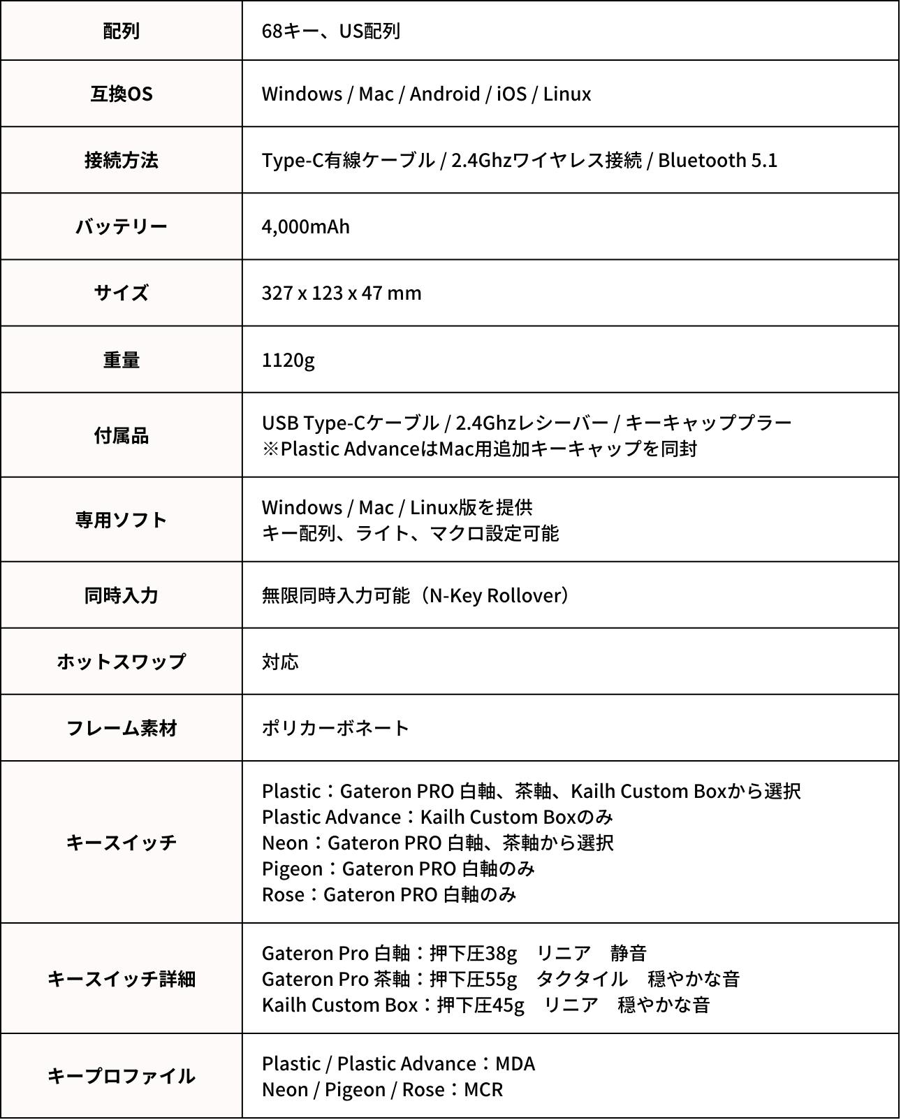 ※モデルによって選択可能なキースイッチが異なります。詳細はリターンに記載している内容をご参照ください。