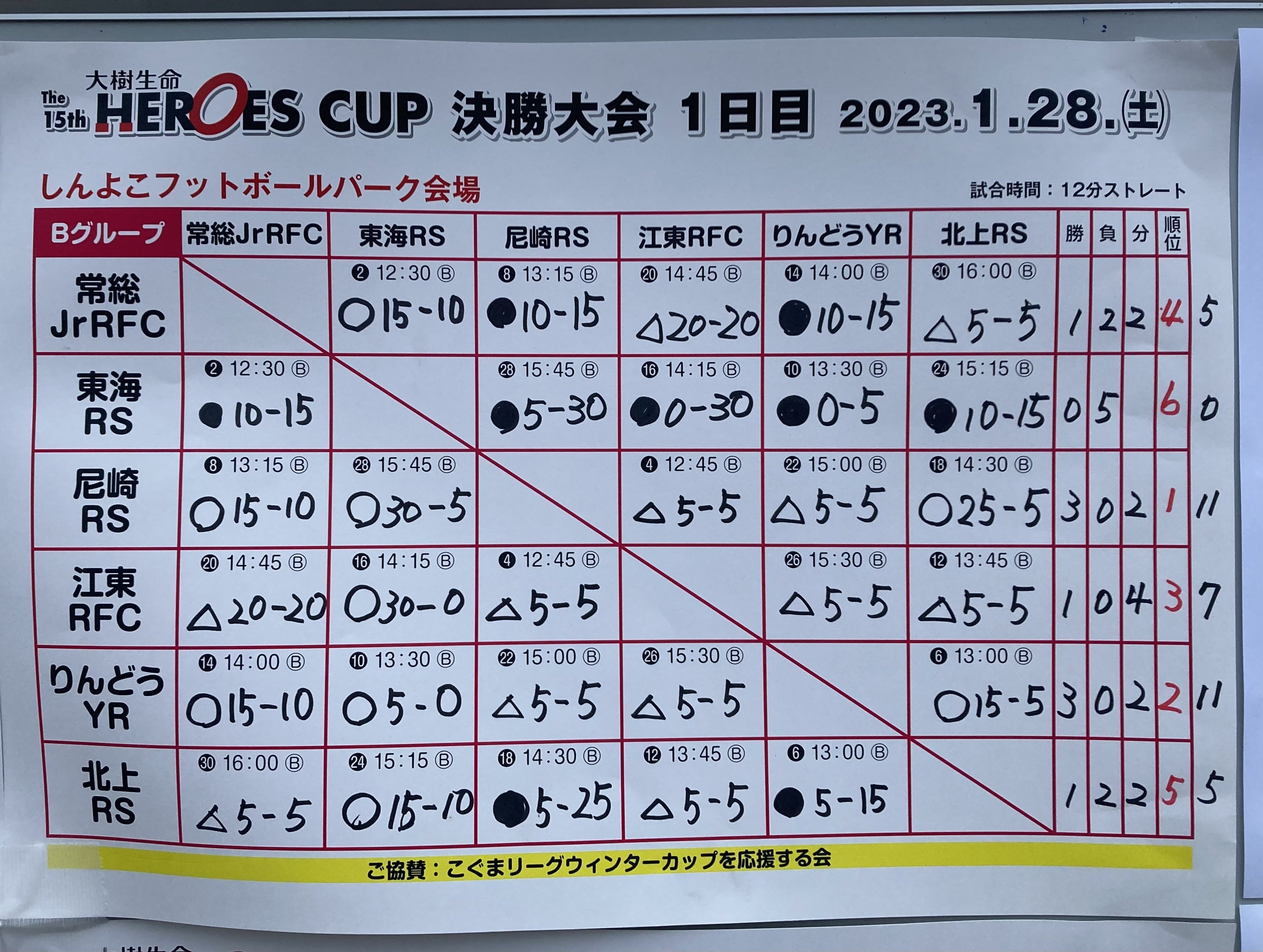 2023/01/28 16:53尼崎ラグビースクールは、第1試合、前回優勝チームの江東と引き分け。第2試合は、逆転勝利!勢いそのままに、1試合1試合負ける事なく、3勝2引き分け。最終試合までカップトーナメント進出をかけて激戦のBブロック。尼崎ラグビースクールは、1位通過でカップトーナメント進出を決めました!!(ベスト8以上確定)負傷者も出ていますが、明日もチーム一丸となって頑張ります。ここまで応援して下さった皆様に感謝です。今日は、しっかり身体を休めて、明日も尼崎ラグビースクールらしく、頑張ります! もっと見る