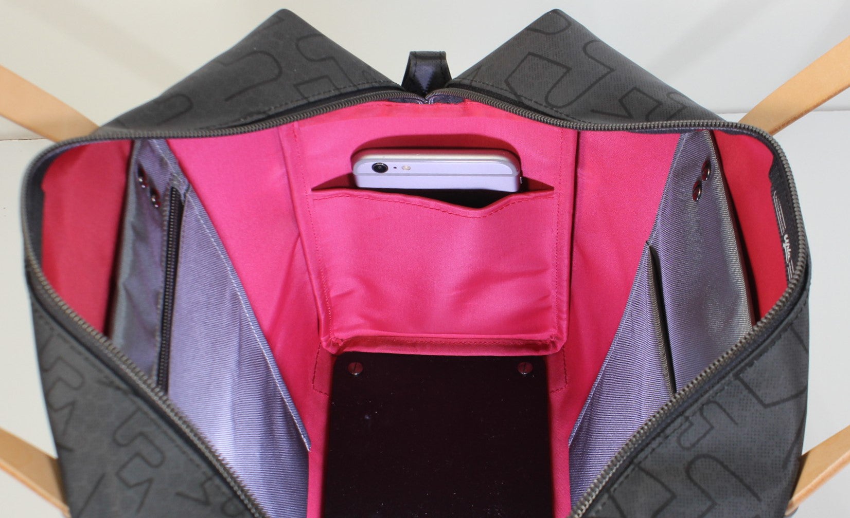 一般的なビジネスバッグは、こういった素材にPVC等で裏打ちして強化した生地をバッグの主素材として用います。この方式だとローコストでできますが、重いわりに生地がクタッとしてしまいます。UPLA独自のWTWPナイロン素材は、高密度ナイロン生地を2枚用いてこれらを全面的にべったりと貼り合わせています。その上に全面プリントを施し、さらにもう一度限界までの細かさで地模様をプリントしています。WTWPナイロンは、このようにダブルのツイル生地とダブルのプリントによって、軽くて丈夫でバッグの素材として理想的なコシの強さを実現しています。撥水性が高いだけでなく、実質的に完全な防水素材です。その防水性は工業試験場によって通常の傘の7倍もの耐水力があることが証明されています。さらに皺になりにくく、汚れが目立ちにくい性能を持っています。