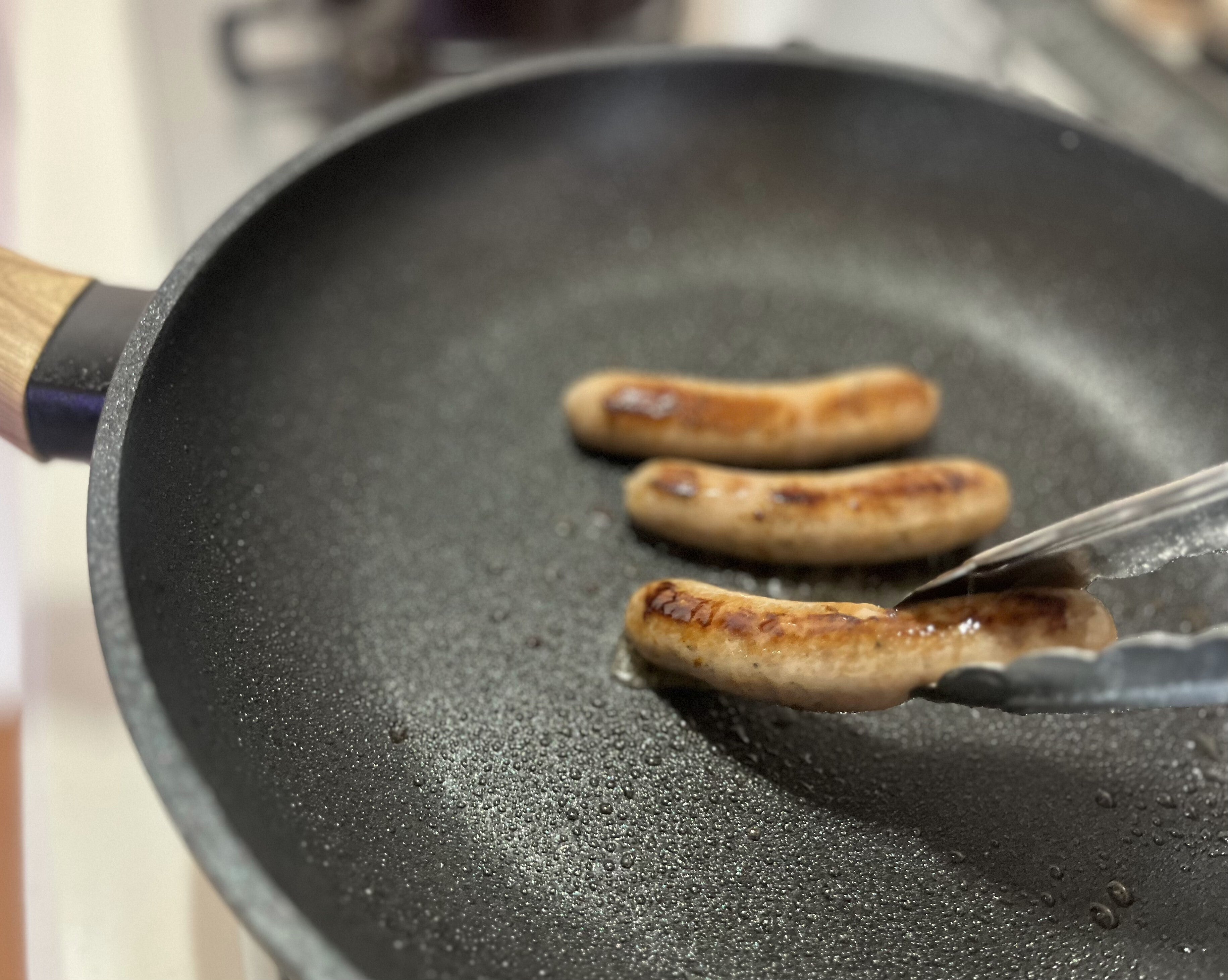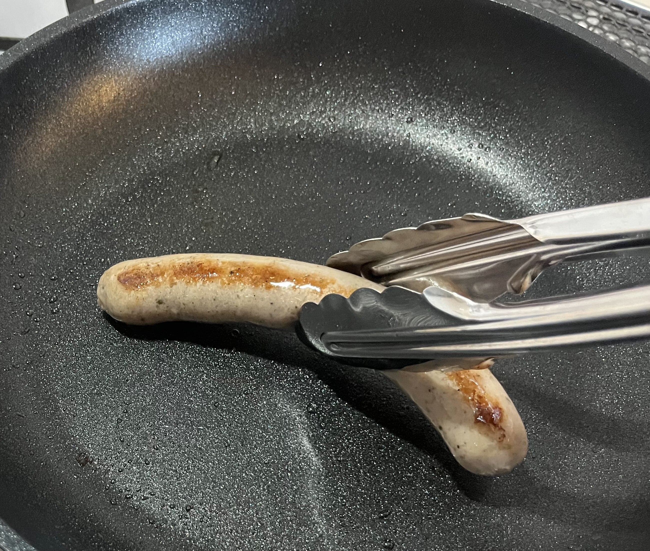 食べる前に冷蔵庫から出しておき室温に戻してから、サラダ油を少量引いたフライパンにソーセージを並べて、蓋をして中火で。サラダ油は必ず引いてください。