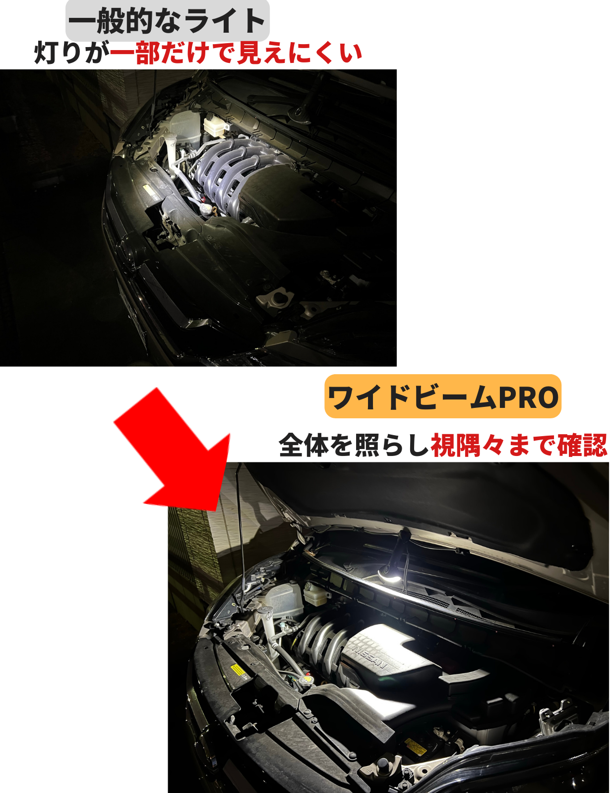 ワイドビームPROは車のボンネットなどにピタッと取り付けられるマグネット付き。両手がフリーになるうえ、広範囲でボンネット内を照らせるのでメンテナンスもはかどります。