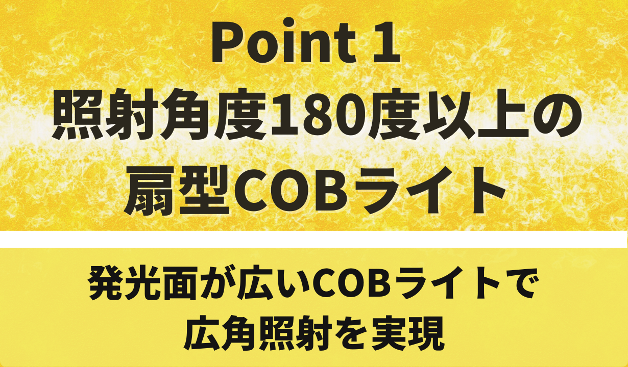COBライトとは近年開発されたLED光源の一つ。COBとは「Chip on Board」の略で、一般的なLEDライトが電球の「点」で発光するのに対し、COBライトは基盤(ボード)にLEDチップが直接載っており「面」で発光するのが特長です。