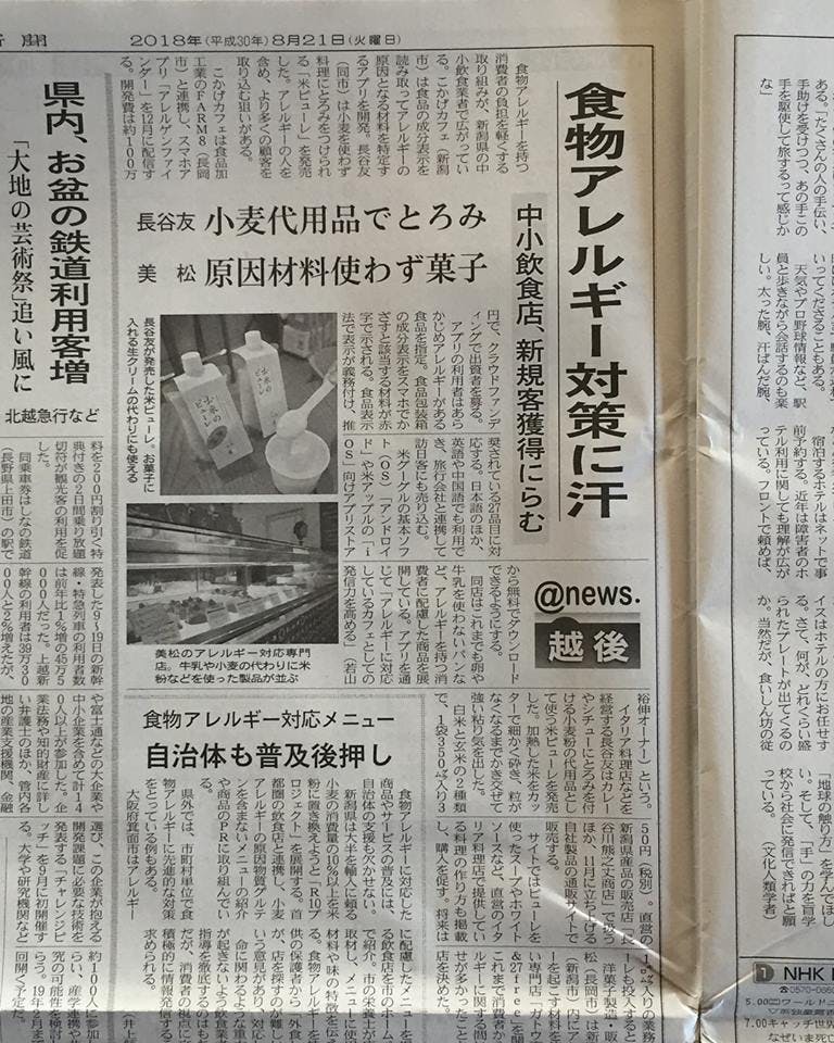 2018/08/22 00:10本日8/2日本経済新聞新潟版に『食物アレルギー対策に汗』という記事で今回のプロジェクトについて掲載頂きました! デジタル版はこちら。 新潟でも食物アレルギー対策に取り組む企業さんもでてきており、なんらかの食物アレルギーをもつ層の増加や健康意識の変化でマーケットとしても無視できない存在になりつつあると実感しております。 マスコミの方にもこのプロジェクトの意義を感じて頂き、取材頂けるということは非常に嬉しいことです。ありがとうございました。 パトロンの皆さまのおかげて支援額が目標の55%に達しました。ファンディング期間も残り18日となっておりますので更なるご支援を頂けるようラストスパート頑張って参ります。 引き続き応援のほどよろしくお願い致します。 もっと見る