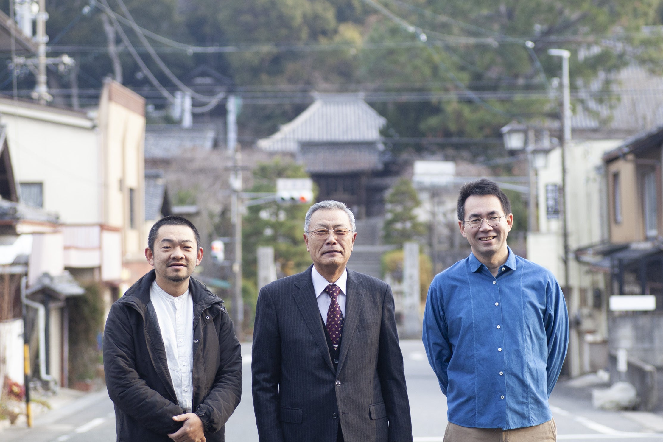 写真右から、実行委員長の竹内亮、岡田街並保存会会長の竹内徳得、デザイナーの高橋孝治