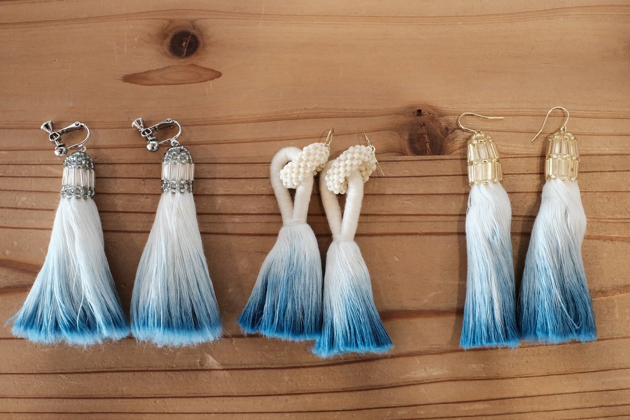 この耳飾りは織る工程ででる残糸を活用して作られた耳飾りです。ビーズ部分も手づくりオリジナルです。通常は白い状態での販売ですがクラファンの返礼品限定として紺屋のナミホさんとコラボ企画ができました。彼女は今回のCHITAMOENTにも出店予定のクリエイターさんです。愛知県常滑市に工房を構えるナミホさんは日々使い、日常に溶け込み当たり前にある存在となる、街の染物屋としての藍を目指して丁寧に泥臭く、藍色を染め上げています。 そんな彼女が染めた藍のグラデーションの耳飾りを返礼品としてお届けいたします。また1点1点染めるので同じものができません。皆様のお手元に届く耳飾りは世界に1つだけの藍の耳飾りになります。