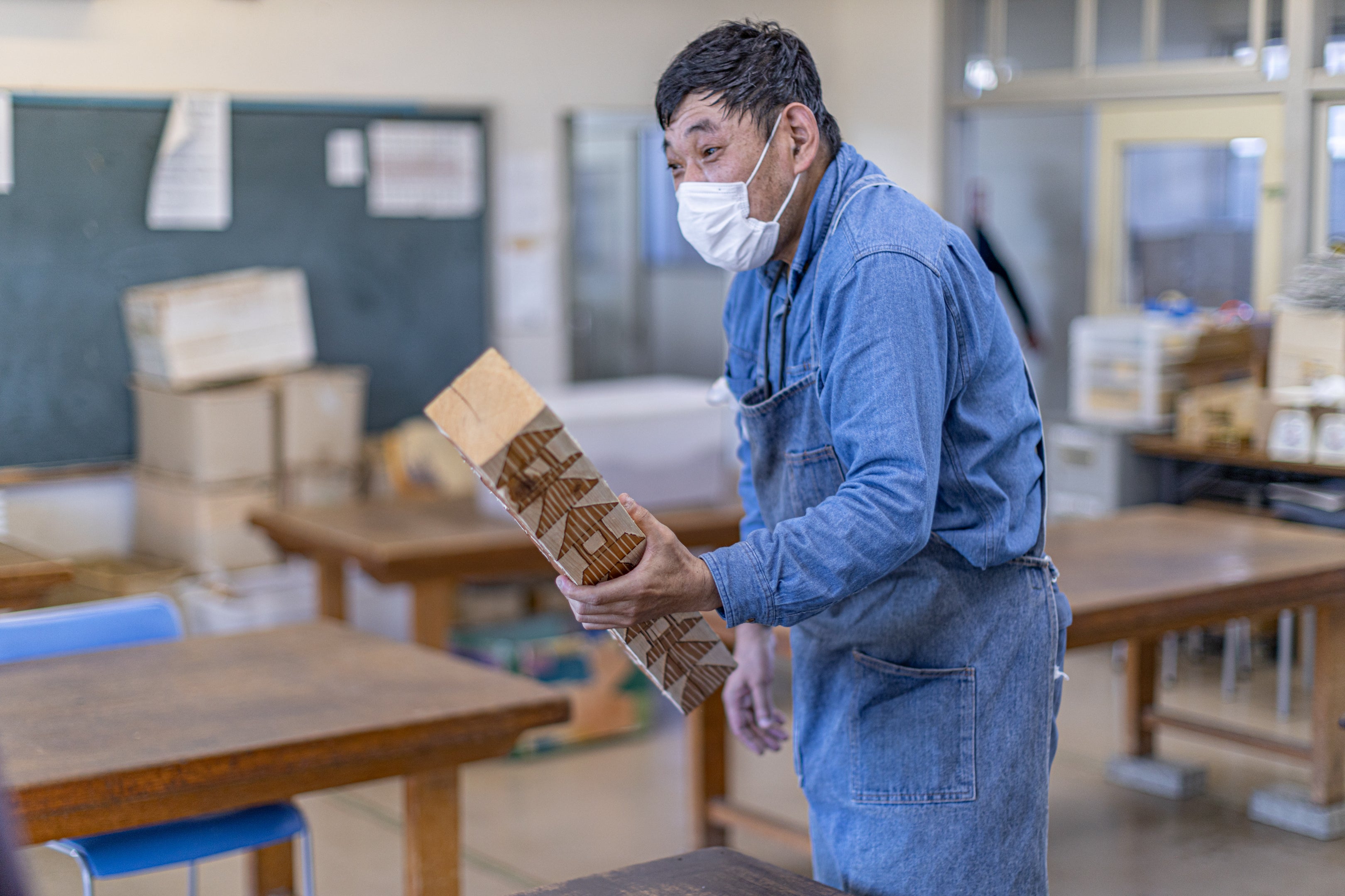 タイルのように連続する模様を木に掘り続ける、WORKCENTERかじまのメンバー杉江和哉さんによる木版「灯篭」を施しました。