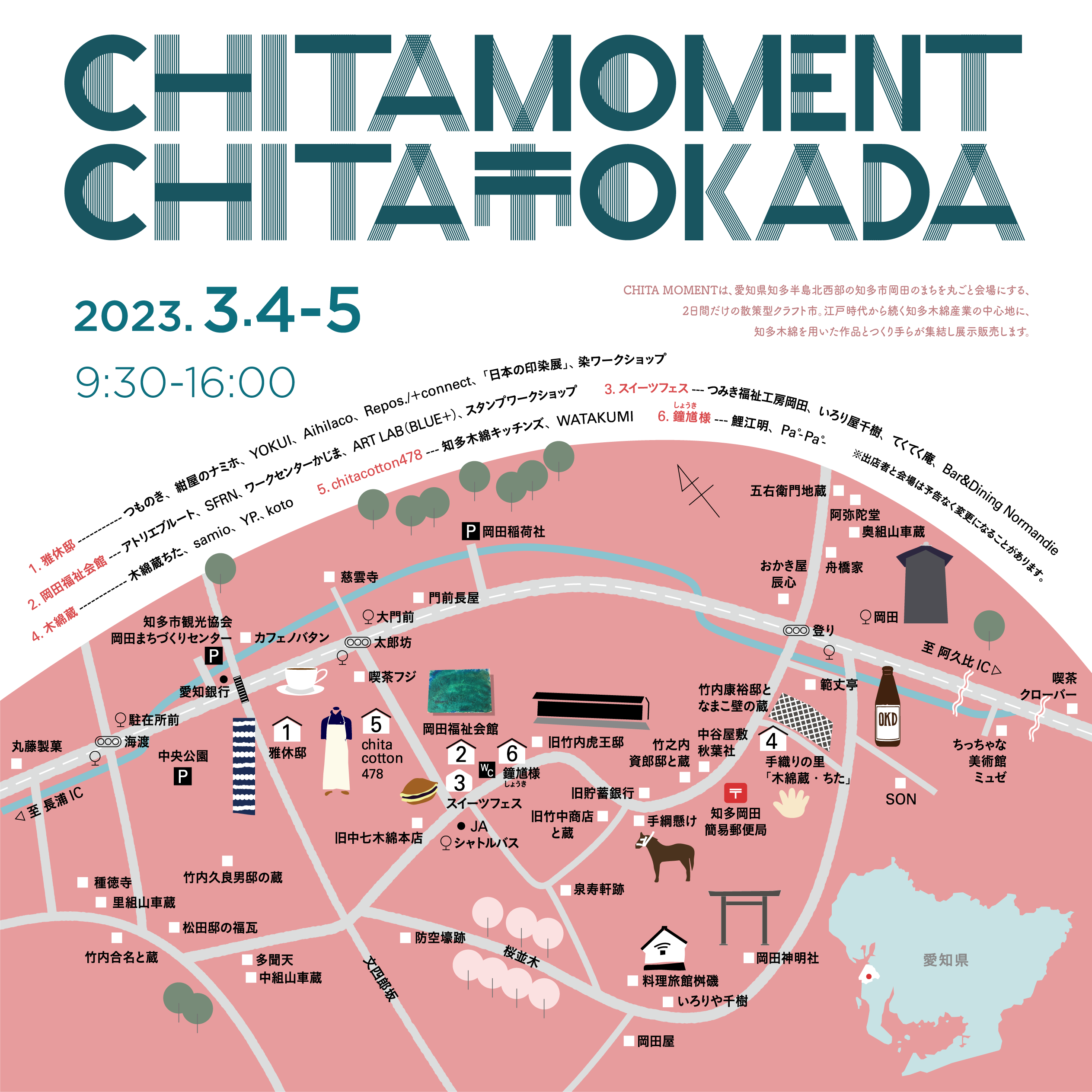 開催場所 愛知県知多市岡田(雅休邸・木綿蔵ちた・岡田福祉会館・旧三河屋・chitacotton478など)