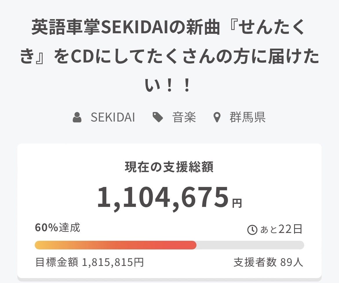 2023/02/06 12:14こんにちは!SEKIDAIです♪応援していただき、本当にありがとうございます!!皆さまのおかげで、目標金額の60%まで到達することができました。目標金額まで残り711,140円というところまでくることができています。ただ、このプロジェクトはAll or Nothing方式で行っております。目標金額まで達しない場合は、支援していただいた皆さまに返金という形をとらざるを得ません。それだけは絶対に避けたいです。残り22日間走り続けます。どうかもう少しの間、力をお貸しください。いつも本当にありがとうございます。SEKIDAI もっと見る