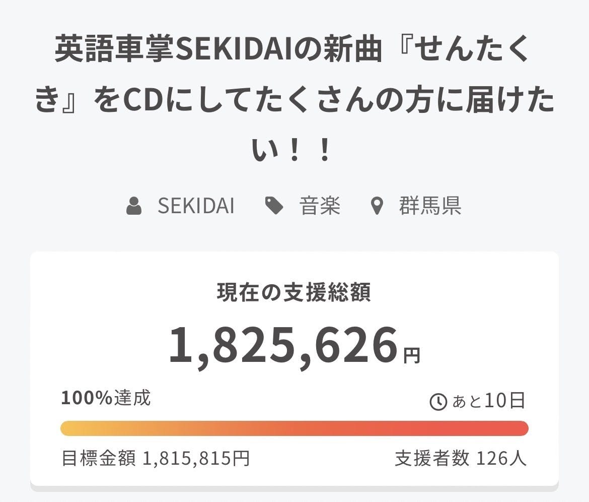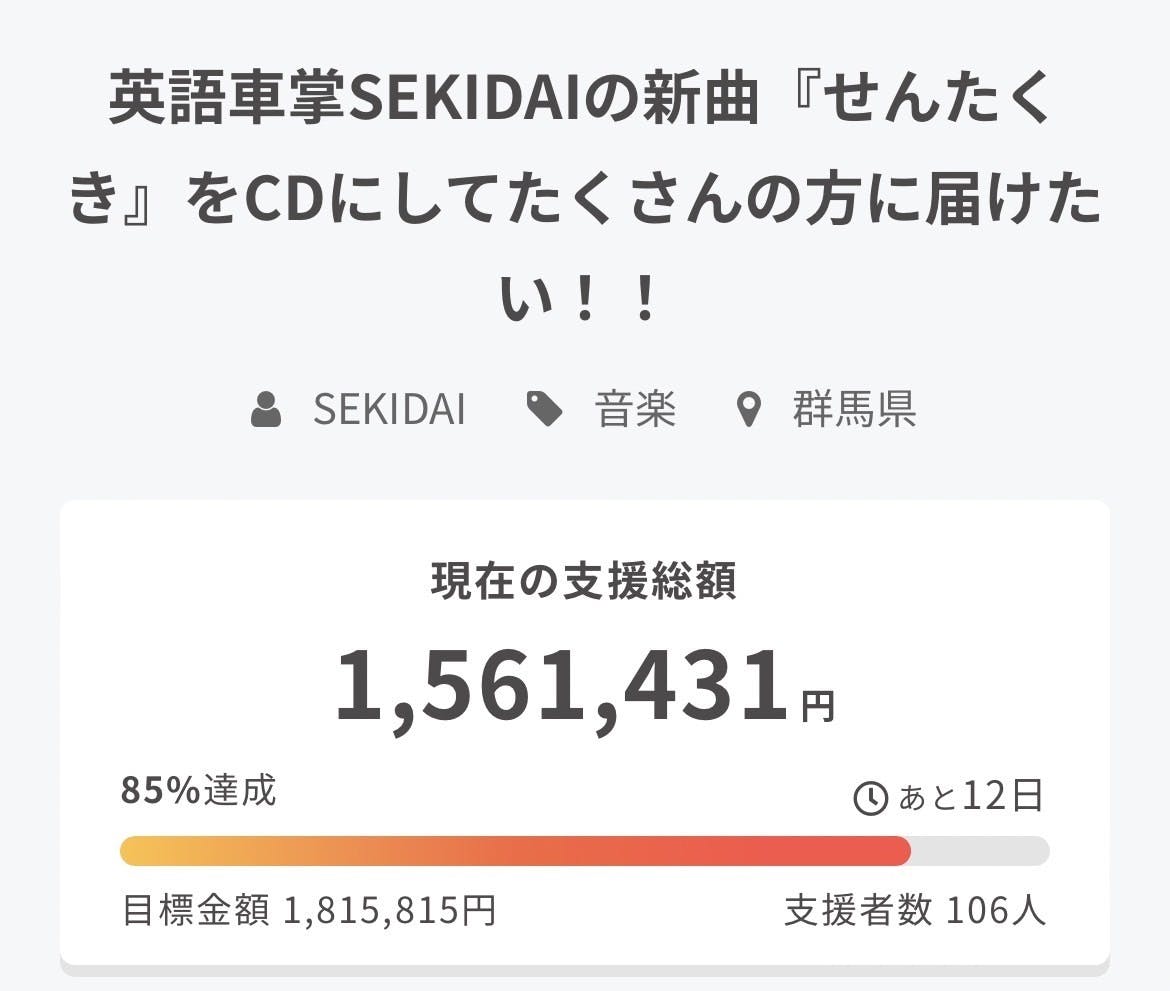 2023/02/19 09:00こんにちは!英語車掌SEKIDAIです!!ご支援いただいた皆さま、本当にありがとうございます!!おかげさまで、2/28に目標金額に到達することができました。これで、皆さまのもとへリターンをお届けすることが確定いたしました。ただ、残り10日ありますので、ここで満足せず最後まで走り抜けたいと思っています。次の目標は200万円。達成できましたら222万円と目標を再設定していきます。どこまで行くのか見届けていただけたら幸いです。本当に感謝しております。SEKIDAI もっと見る
