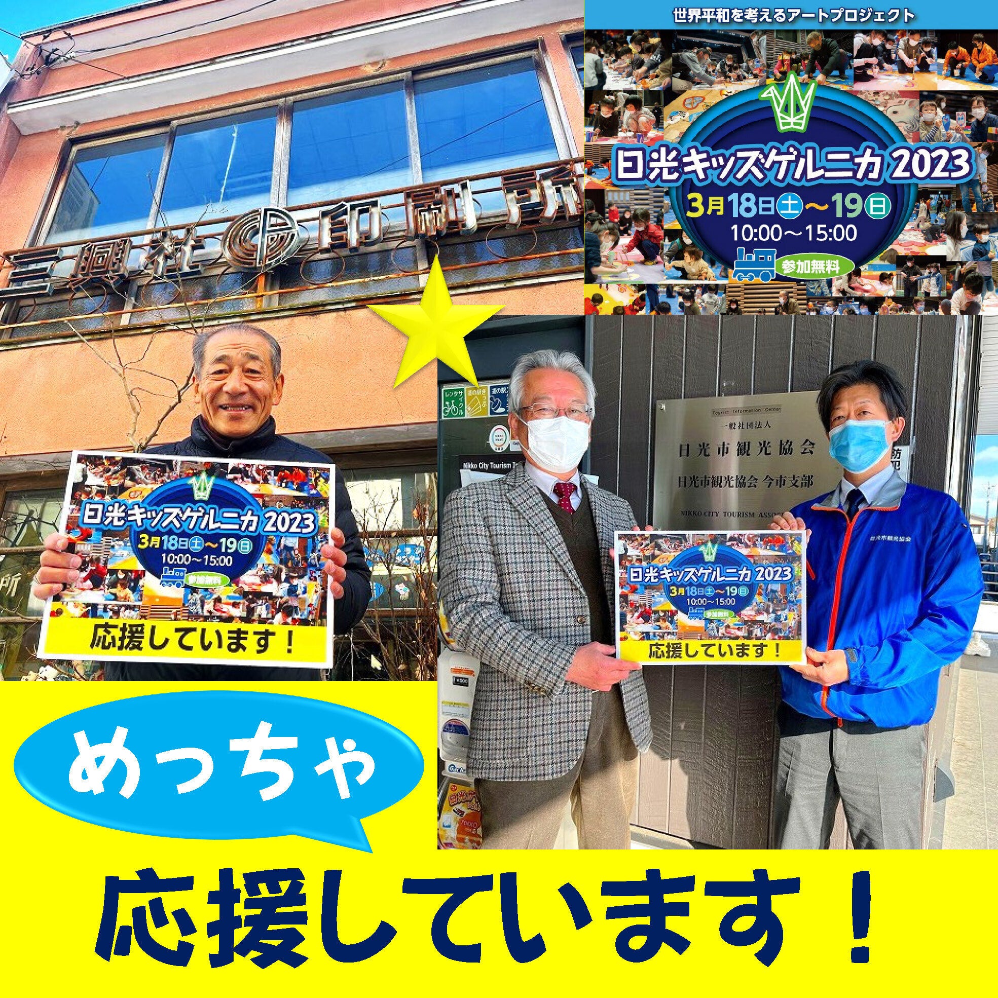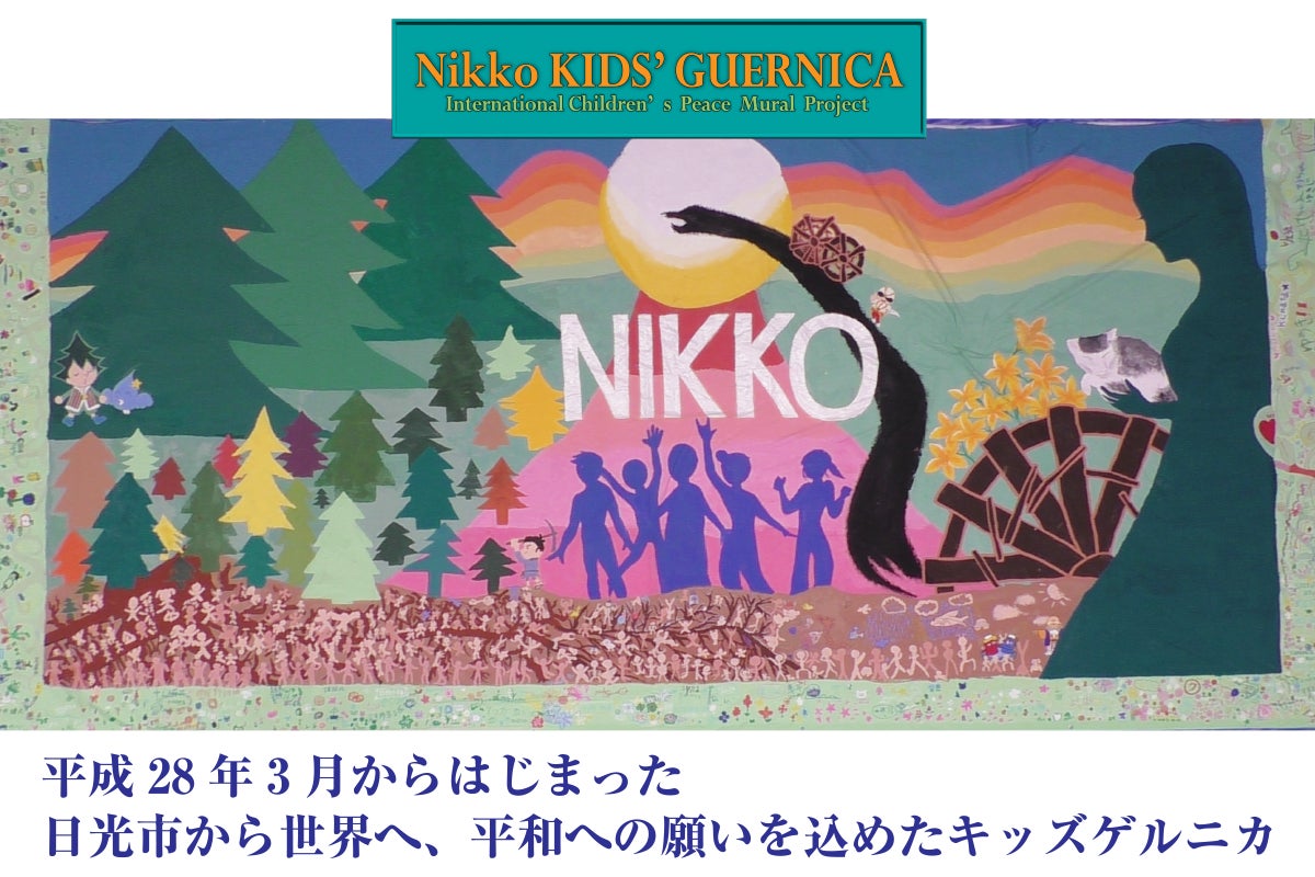 「日光キッズゲルニカ」は平成27年4月に開業した 道の駅日光 日光街道ニコニコ本陣(栃木県日光市)にあるホールの壁に、『日光』から世界へ、人種や言葉の壁を越えて平和を祈って描くメッセージアートとして、毎年3月20日の「日光市民の日」に開催しています。 「日光キッズゲルニカ」は、地域のボランティア団体として制作委員会をつくり、そのメンバーと日光の子どもたちを含む広く一般公募で集まった子供たちが制作に取り組みます。このプロジェクトは平和の大切さを考える機会として、平成28(2016)年が初回でこれまでに6枚のアートを描き、今回で7枚目となります。