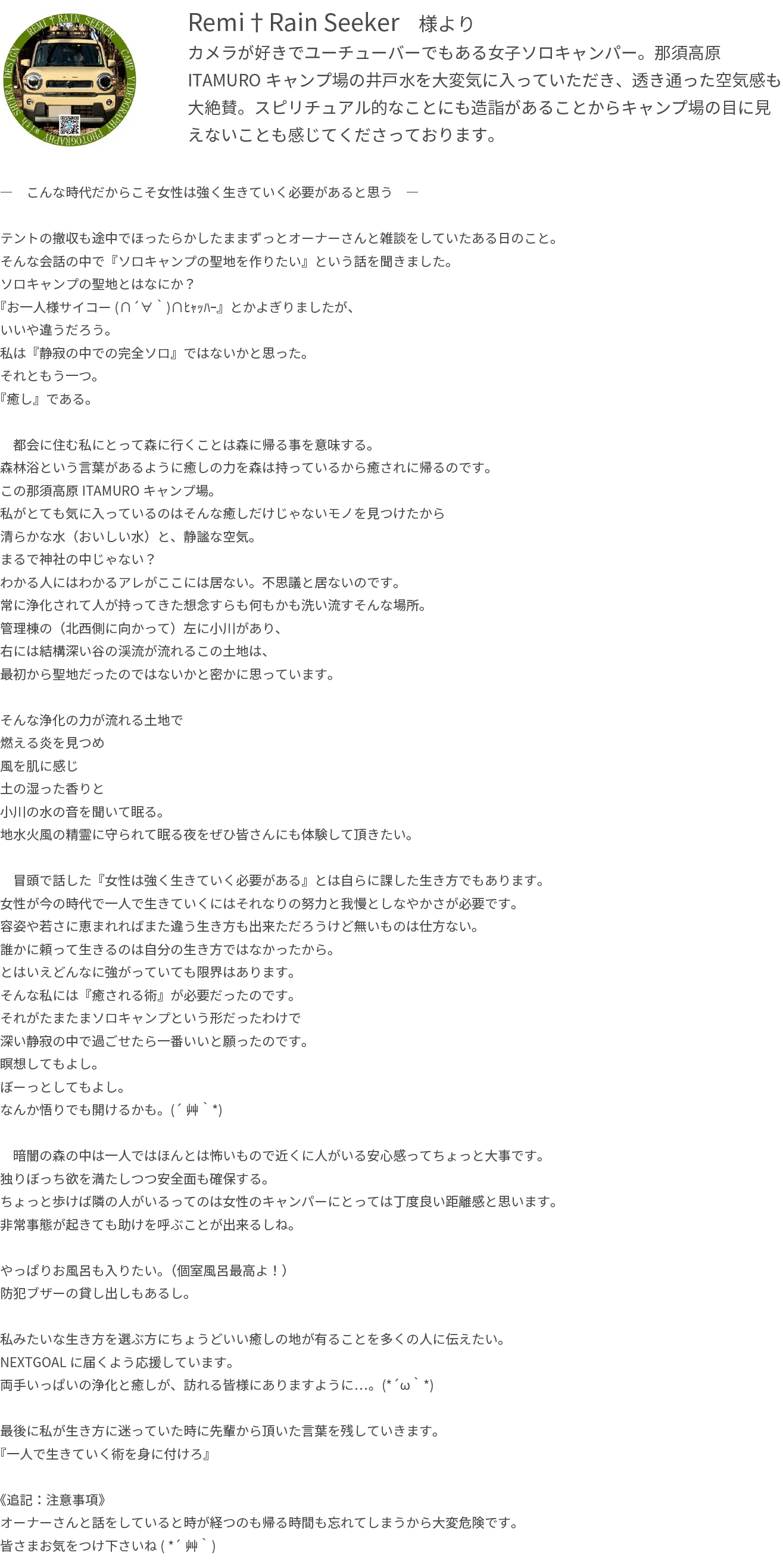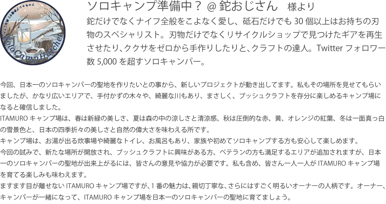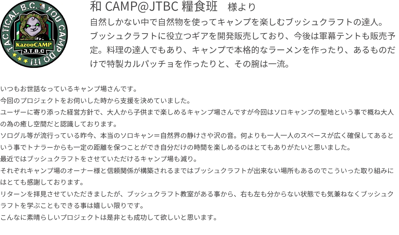 快適な環境の「日本一のソロキャンプの聖地」を造るためにも、ぜひとも皆々様方のご支援とご協力のほど、何卒よろしくお願い申し上げます!!