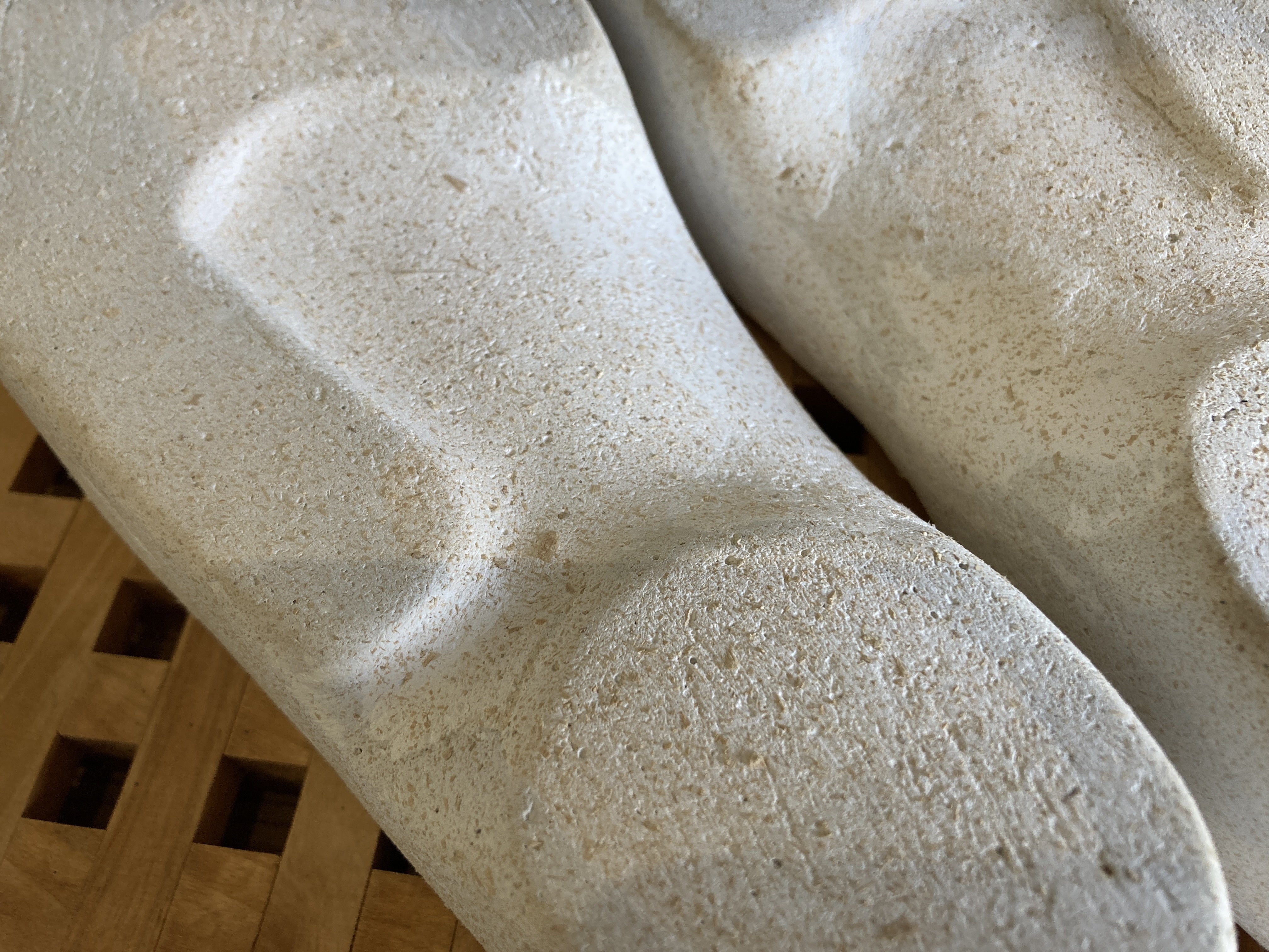 身体形状を再現する際に使う石膏に、神社仏閣の建築作業で出る削り屑を混ぜて製作しました。それにより、最終的に産業廃棄物として破棄される石膏の使用量を減らしつつ、残る身体のモデルを保管する上で、ヒノキなどの木の香りが感じられるものに変わり、重量も軽くなり作業を行いやすくなった取り組み。