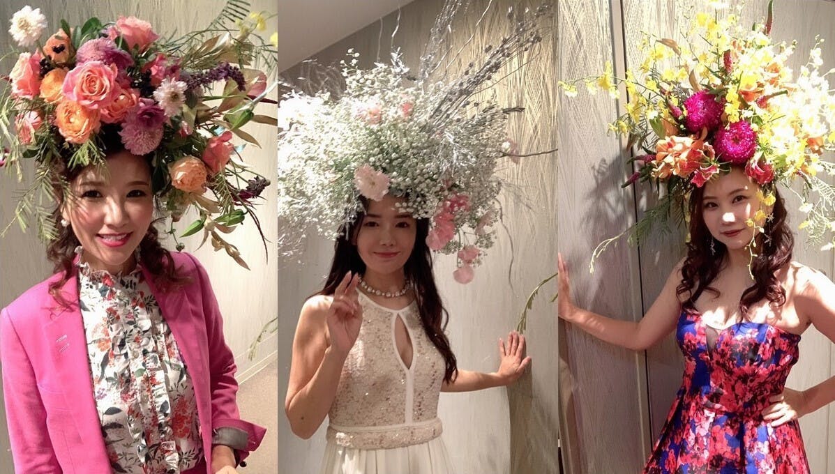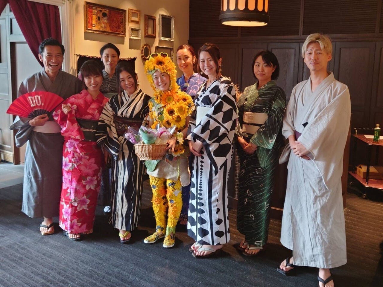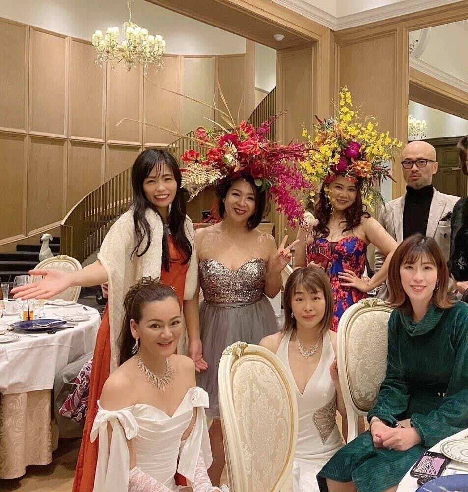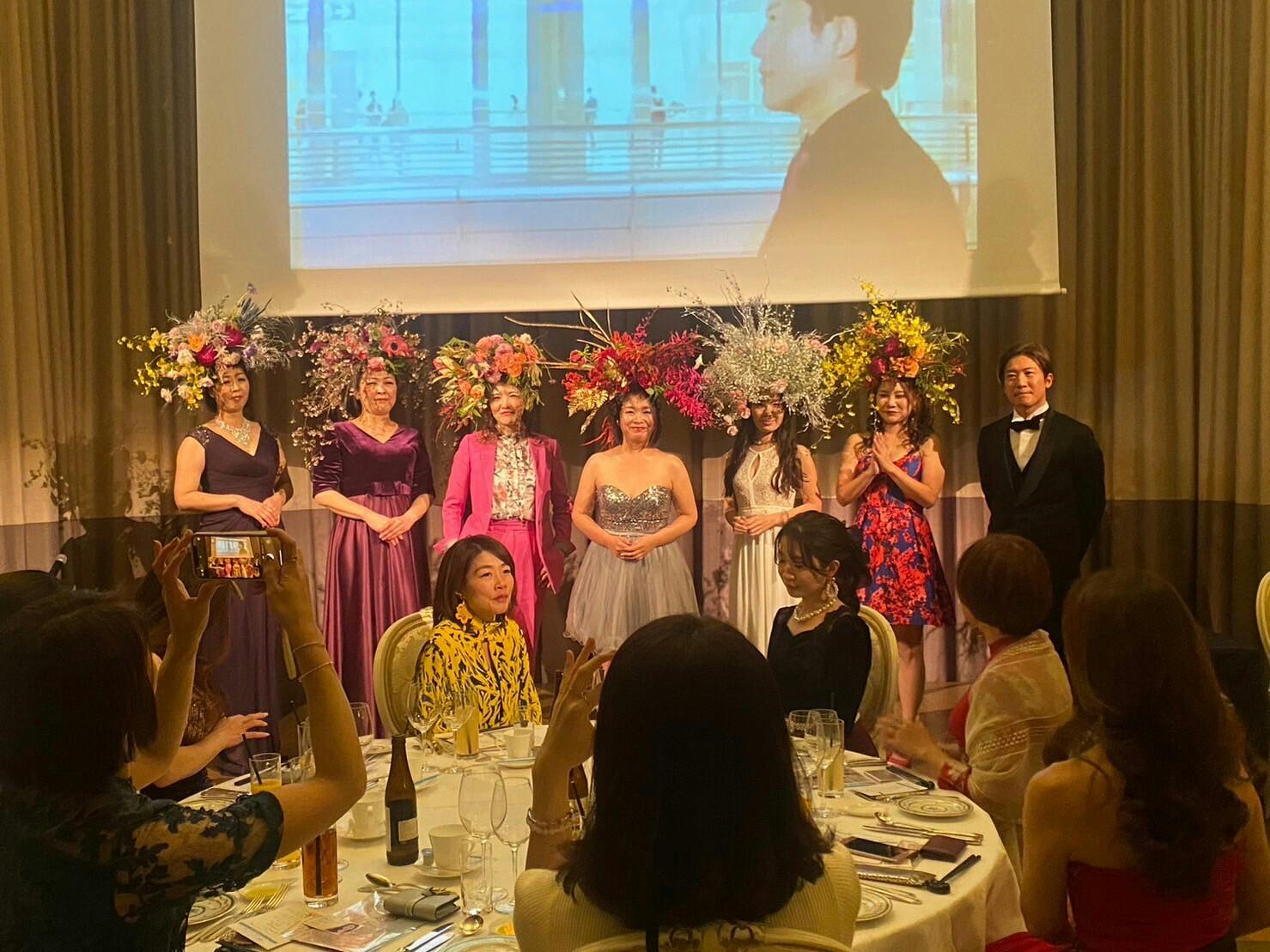 パーティーではみなさん、とびきりおめかしをしてドレスアップして、食事と会話を楽しみました。私たち7人のメンバーは花人間アーティストに「花人間」にしてもらい、こちらもとても好評でした。