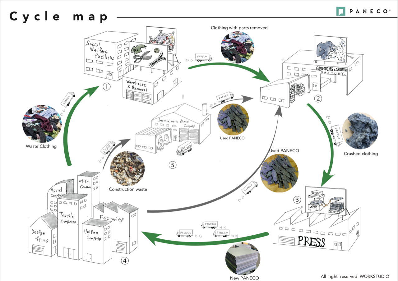 はじめまして。衣類を粉砕して作る「PANECO(パネコ)」と呼ばれる繊維リサイクルボードを開発した、 株式会社ワークスタジオ 代表取締役の原です。