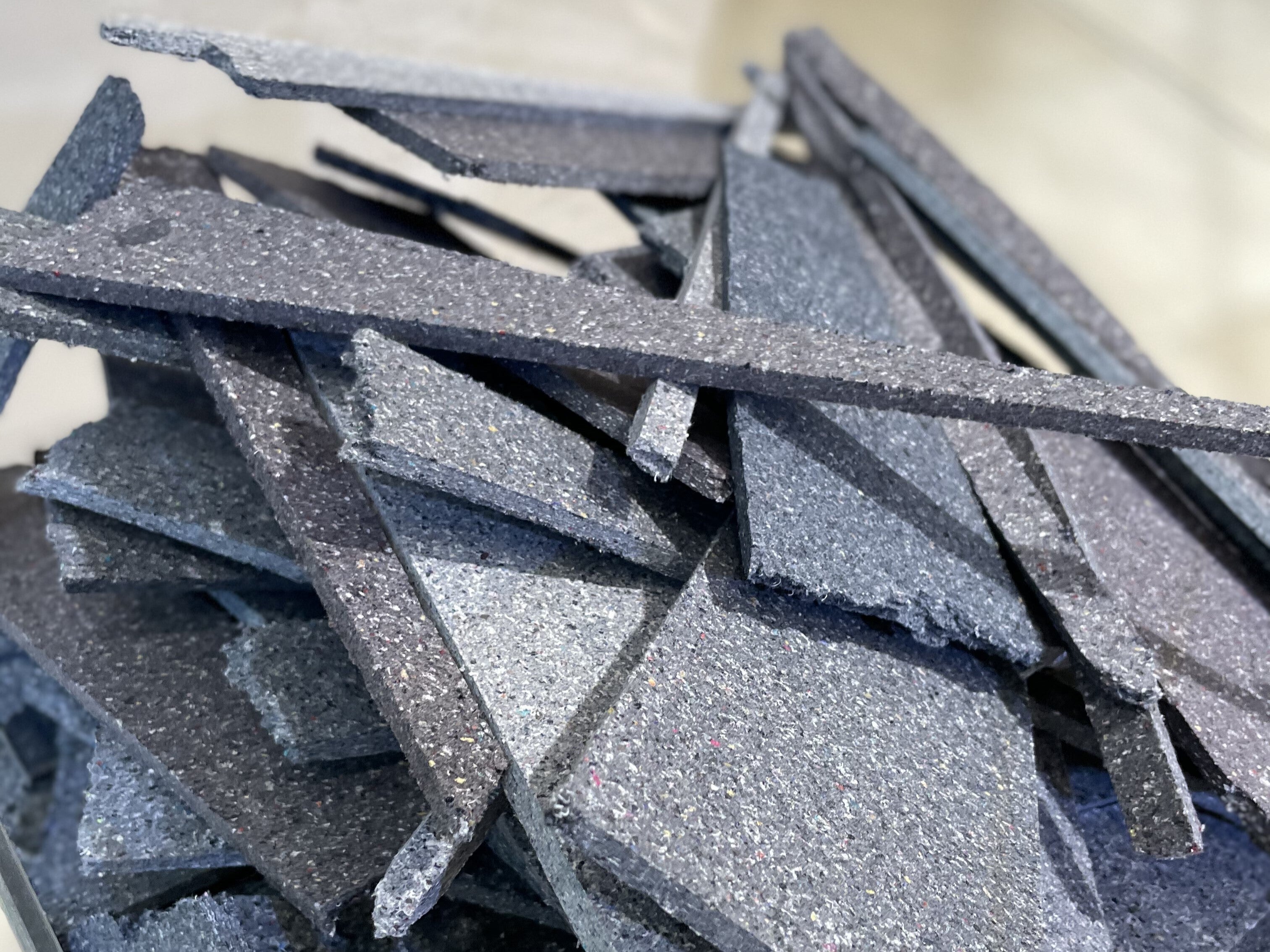 1度目は、初めて服がボードになったものの廃棄衣類を30%しか含むことができず、PANECOそのものを再リサイクルできる素材にならなかった時でした。