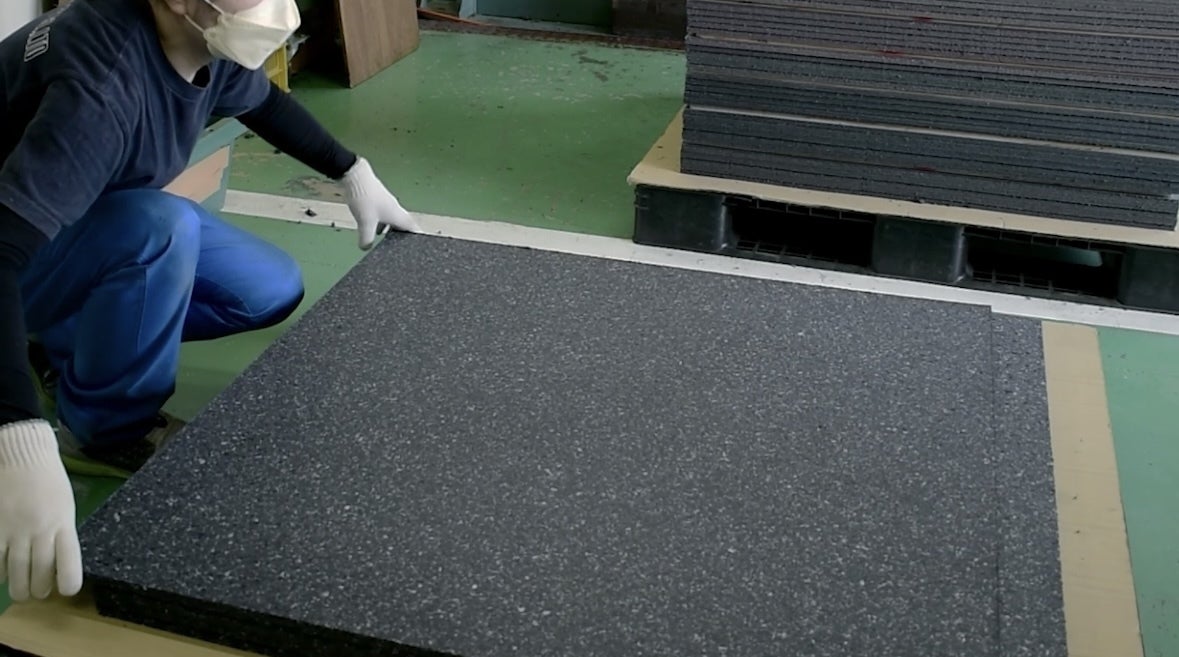 成型工場に運ばれ粉砕された廃棄衣類は、プレス成型で繊維リサイクルボード「PANECO」として生まれ変わります。