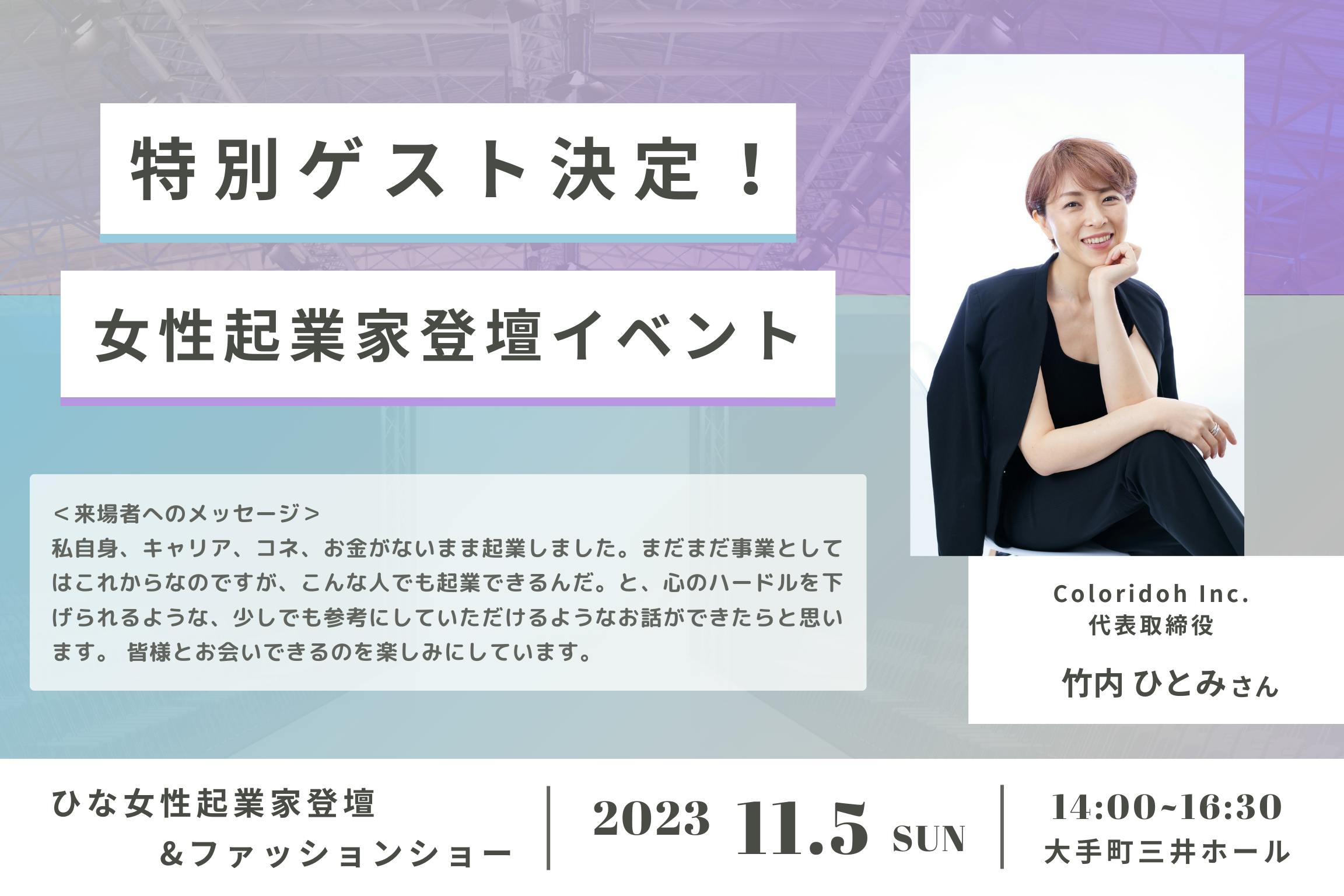 突然ですが、来たる2023年11月5日に、起業して間もない新鋭女性起業家の特別登壇ステージと、当社アパレルブランド「SAKI OKUBO」のファッションショーを開催いたします。