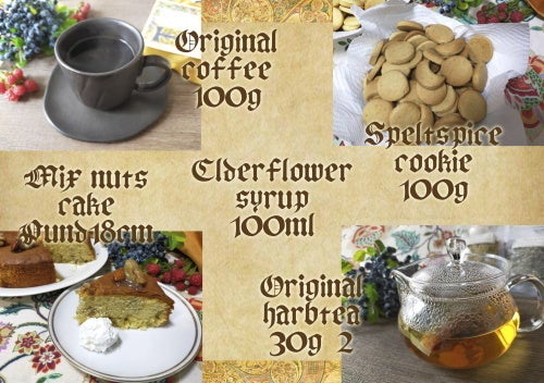テューアオリジナルブレンドコーヒー(100g)と、癒しのハーブティー(30g)、集中のハーブティー(30g)、エルダーフラワーシロップ(100ml)、ミックスナッツのケーキ、シードケーキ、ミックスベリーのケーキ、スペルト小麦のスパイスクッキー(100g)、レモンクッキー(100g)、ワインゼリー(100g)のセットです。